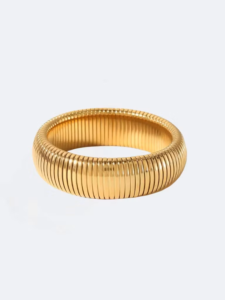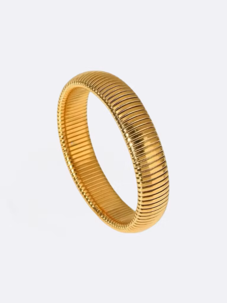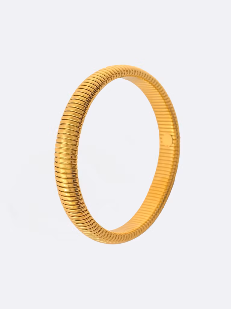 Bangle i högpolerat rostfritt stål som är PVD-pläterat med 18K guld. Tidlöst smycke tillverkat i ett vattentåligt, allergivänligt och slitstarkt material som håller dem fina länge. Bada, duscha och träna utan att oroa dig för att de ska tappa färg.