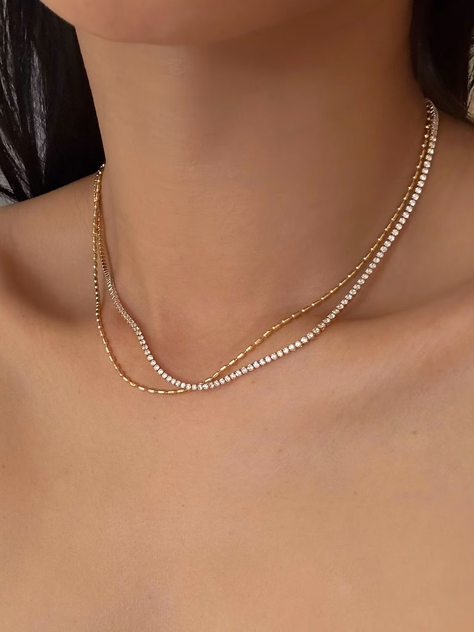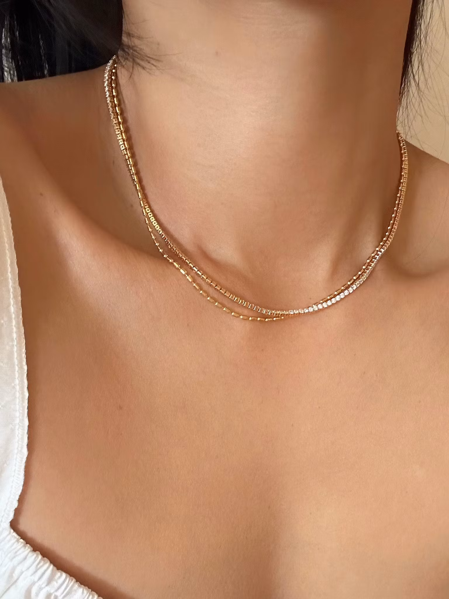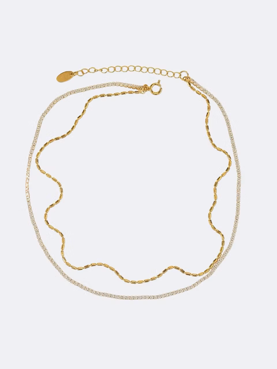 Dubbelhalsband i guldfärgad metall med glasstenar. Ett stilrent halsband med skimrig detalj som passar både till vardags och till fest. Kedjorna fäster i samma spänne och kan inte användas separat.