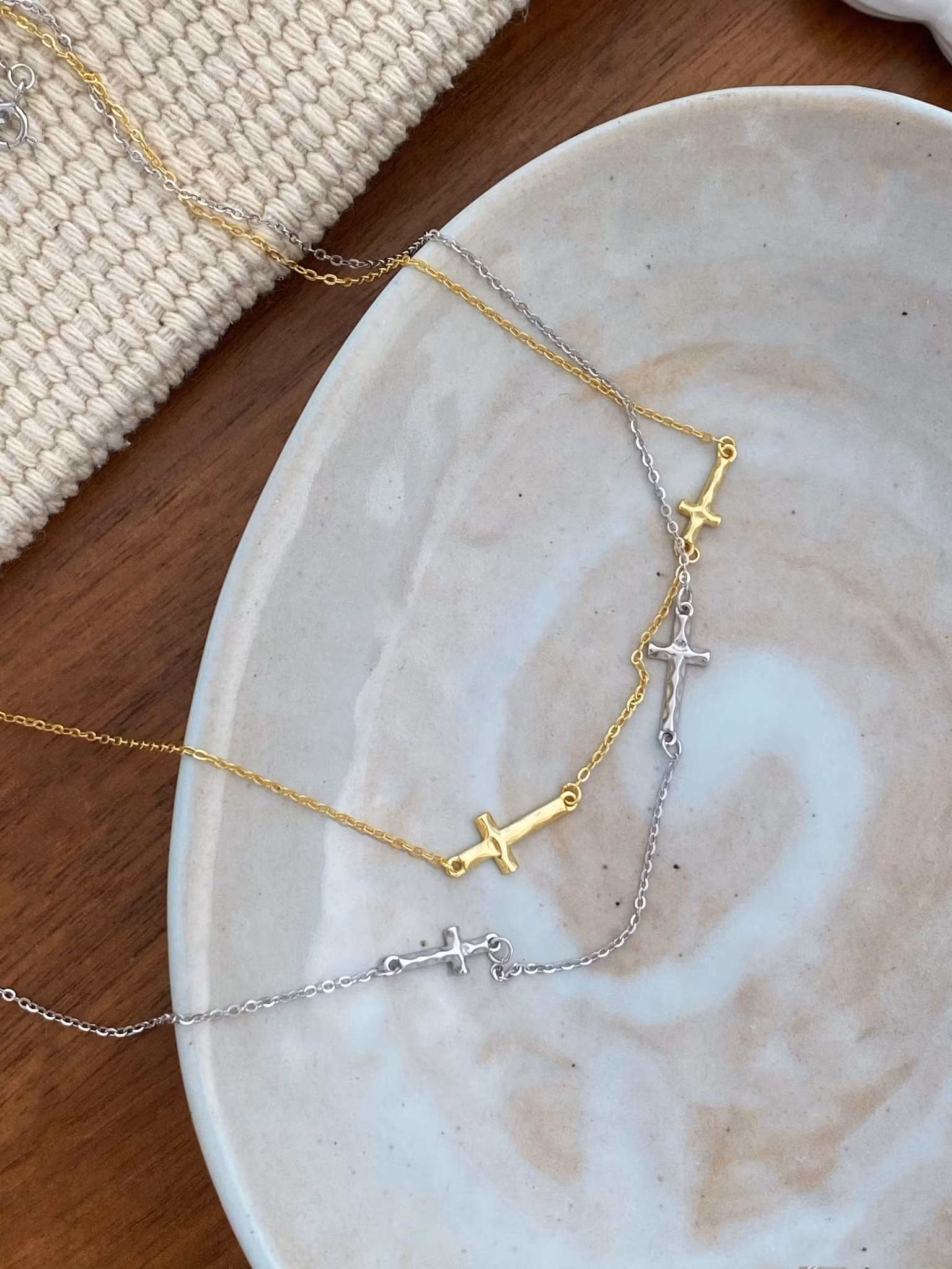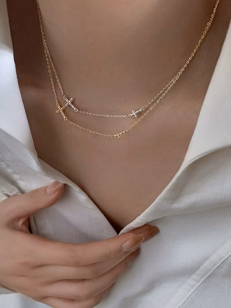 Dekorativt halsband i äkta silver med kedja och två stilrena hängen av små kors.