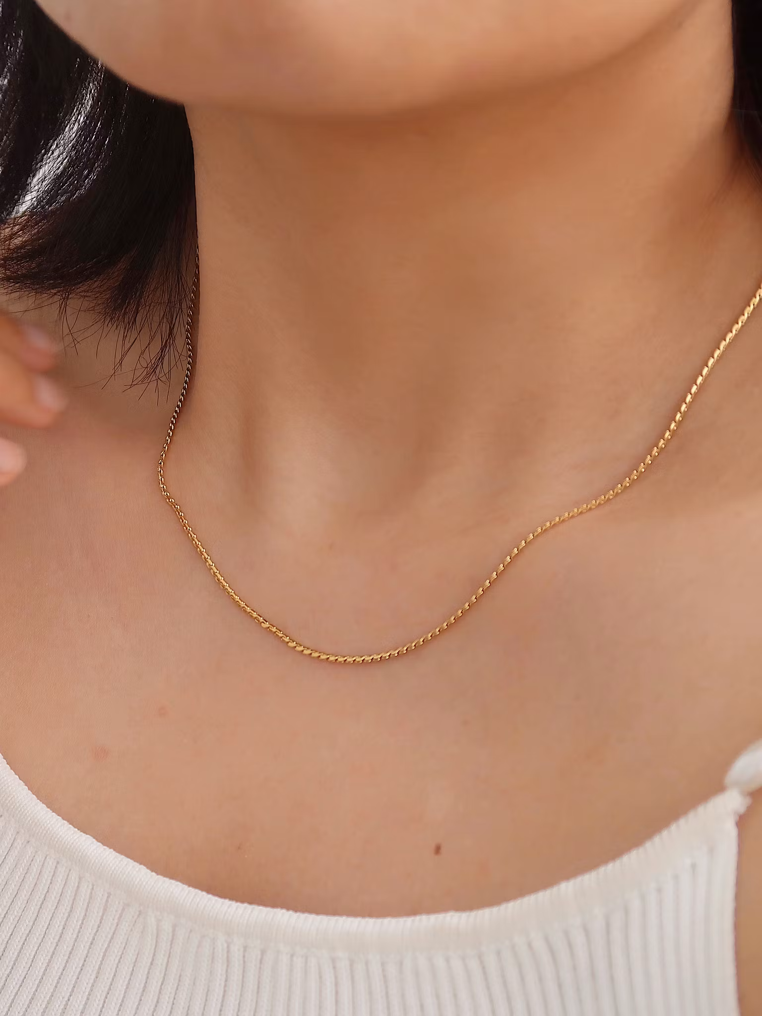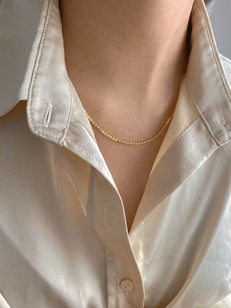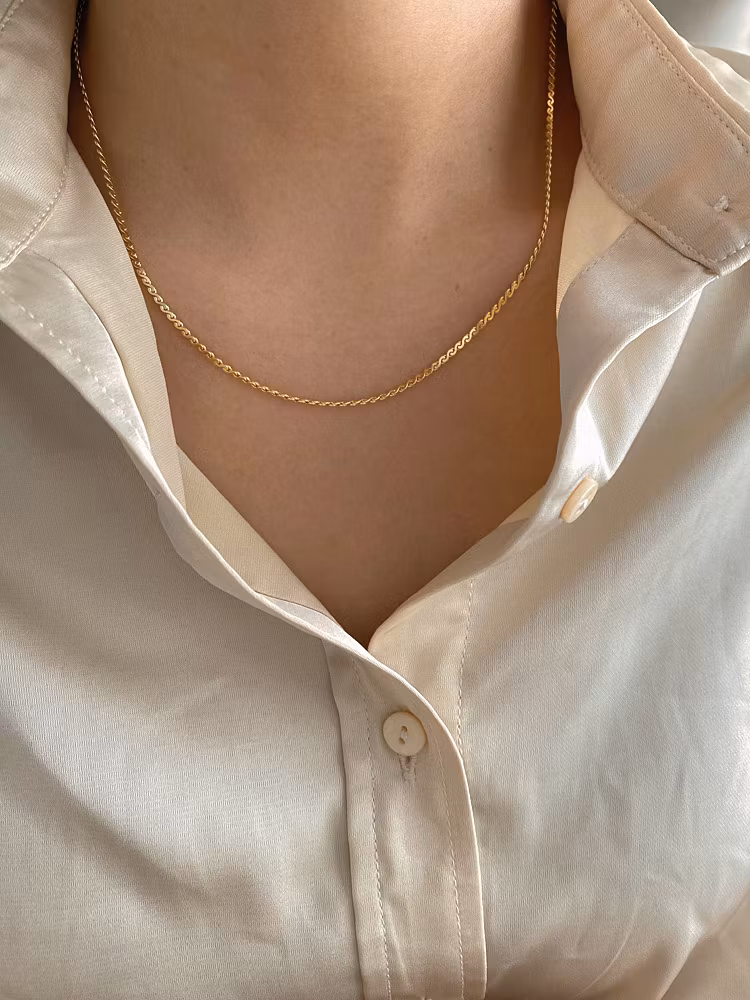 Halsband i högpolerat rostfritt stål som är PVD-pläterat med 18K guld. Tidlöst smycke tillverkat i ett vattentåligt, allergivänligt och slitstarkt material som håller dem fina länge. Bada, duscha och träna utan att oroa dig för att de ska tappa färg.