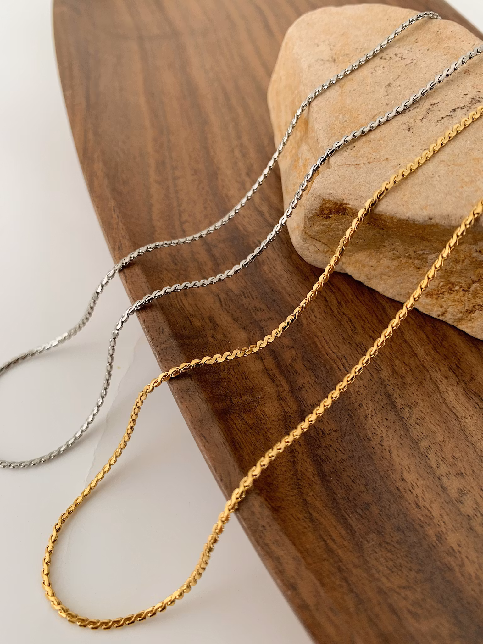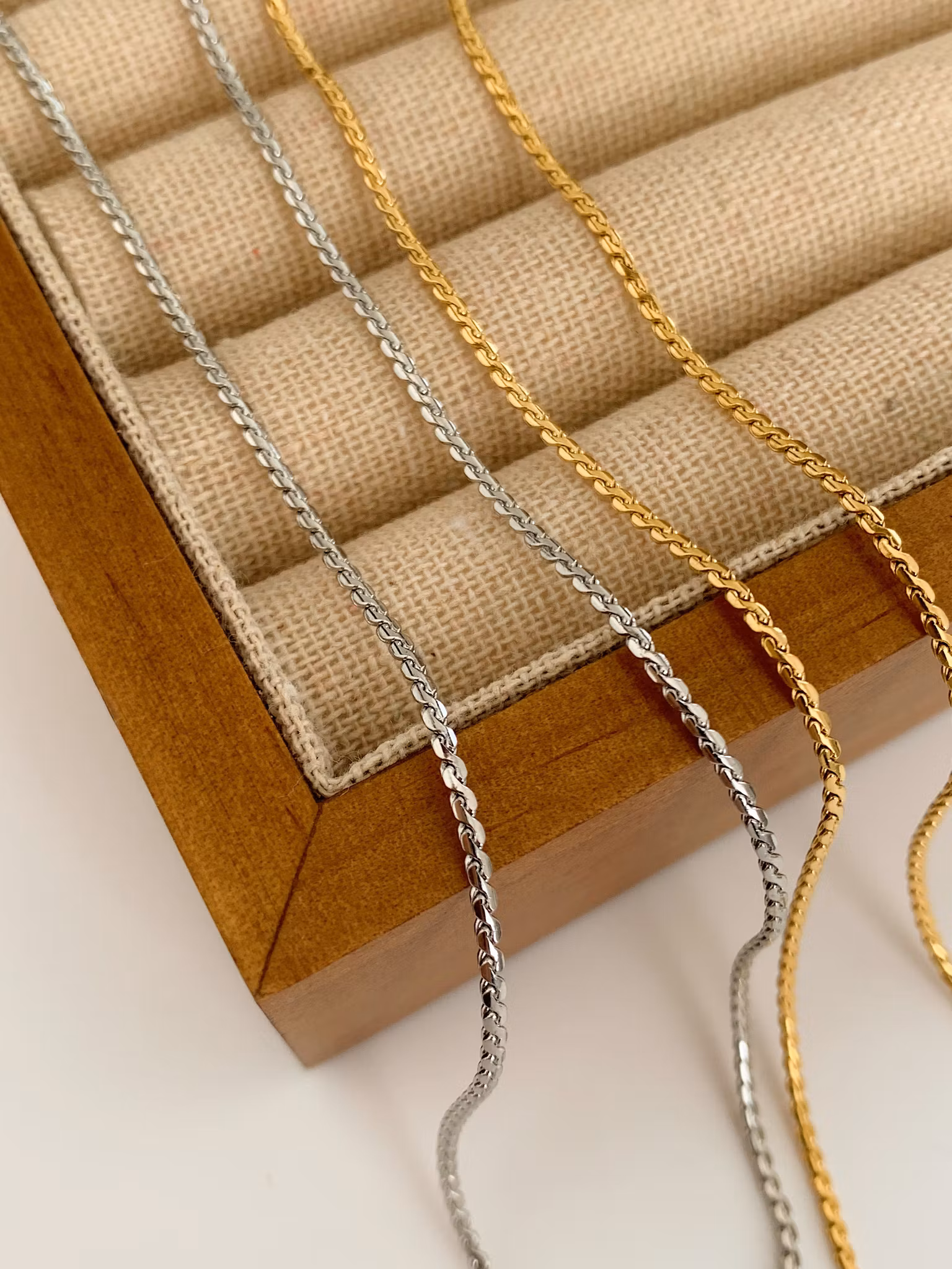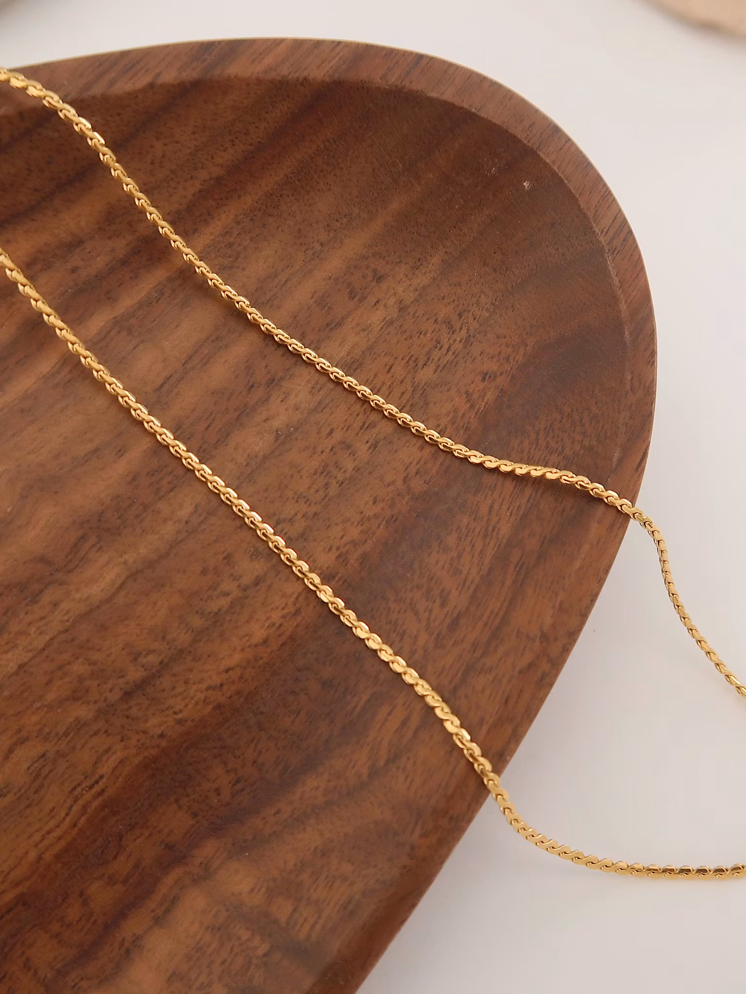 Halsband i högpolerat rostfritt stål som är PVD-pläterat med 18K guld. Tidlöst smycke tillverkat i ett vattentåligt, allergivänligt och slitstarkt material som håller dem fina länge. Bada, duscha och träna utan att oroa dig för att de ska tappa färg.