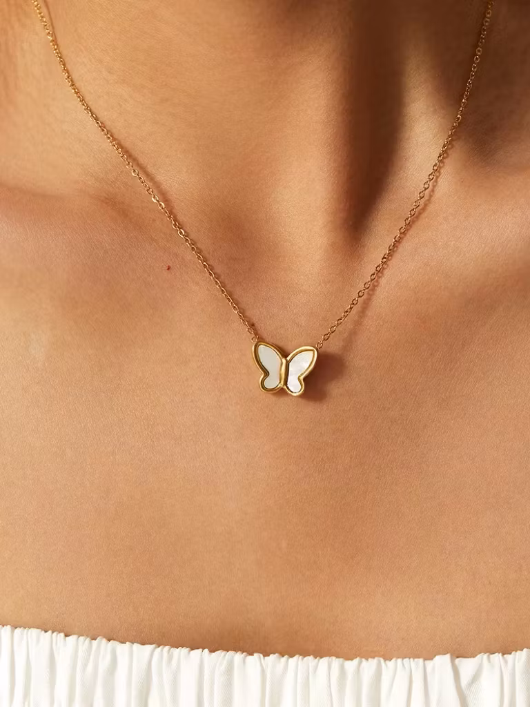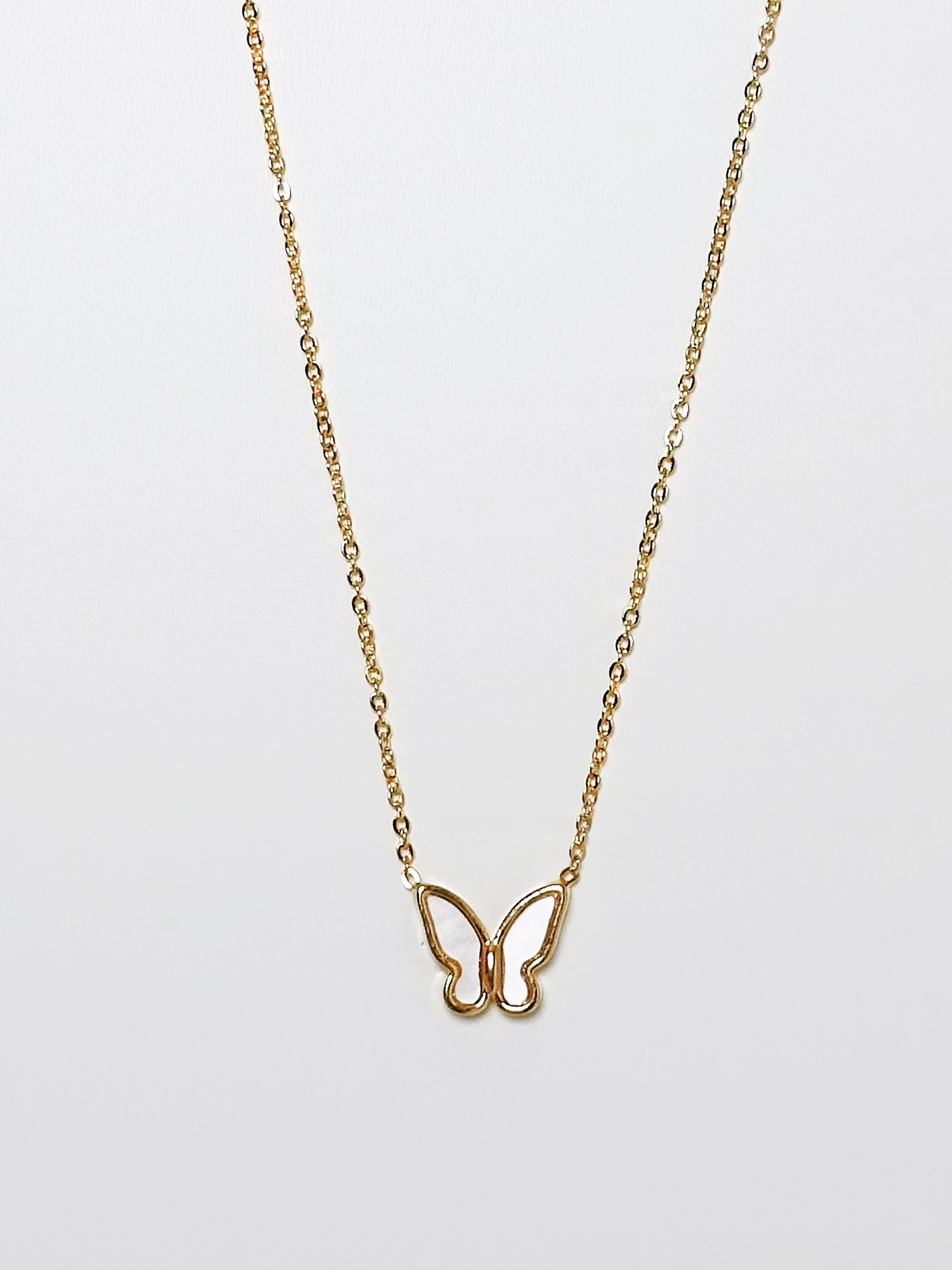 Halsband i guldfärgad metall med klassisk kedja och hängen av små fjärilar utsmyckade. Ett dekorativt halsband med skimrande detaljer.