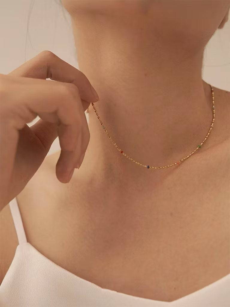 Halsband i högpolerat rostfritt stål som är PVD-pläterat med 18K guld. Tidlöst smycke tillverkat i ett vattentåligt, allergivänligt och slitstarkt material som håller dem fina länge. Bada, duscha och träna utan att oroa dig för att de ska tappa färg.