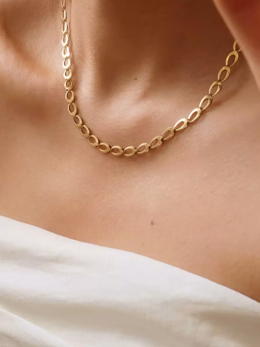 Kedjehalsband i högpolerat rostfritt stål som är PVD-pläterat med 18K guld.