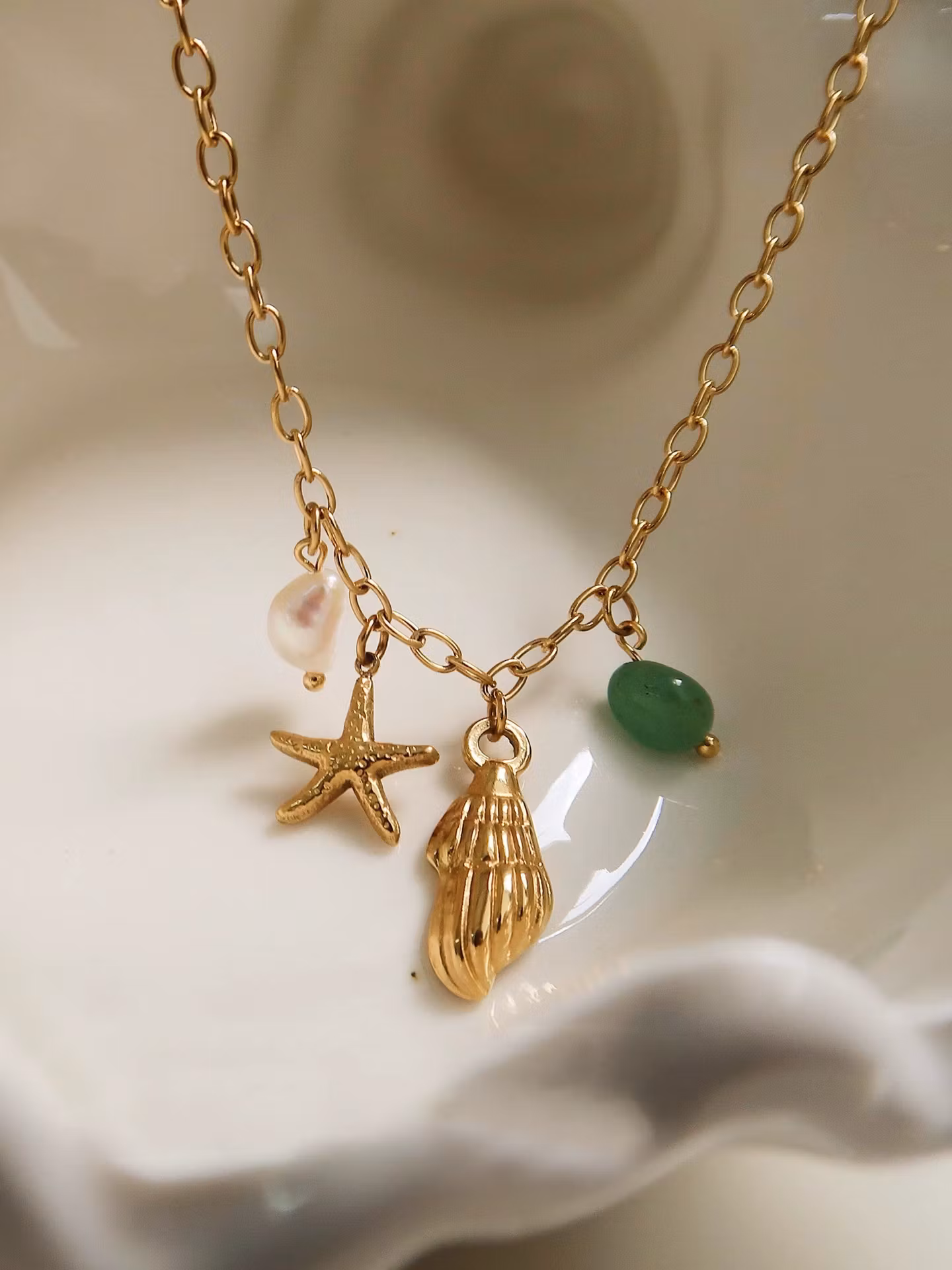 Halsband i stål med 18K guld med sjöstjärna och pärla