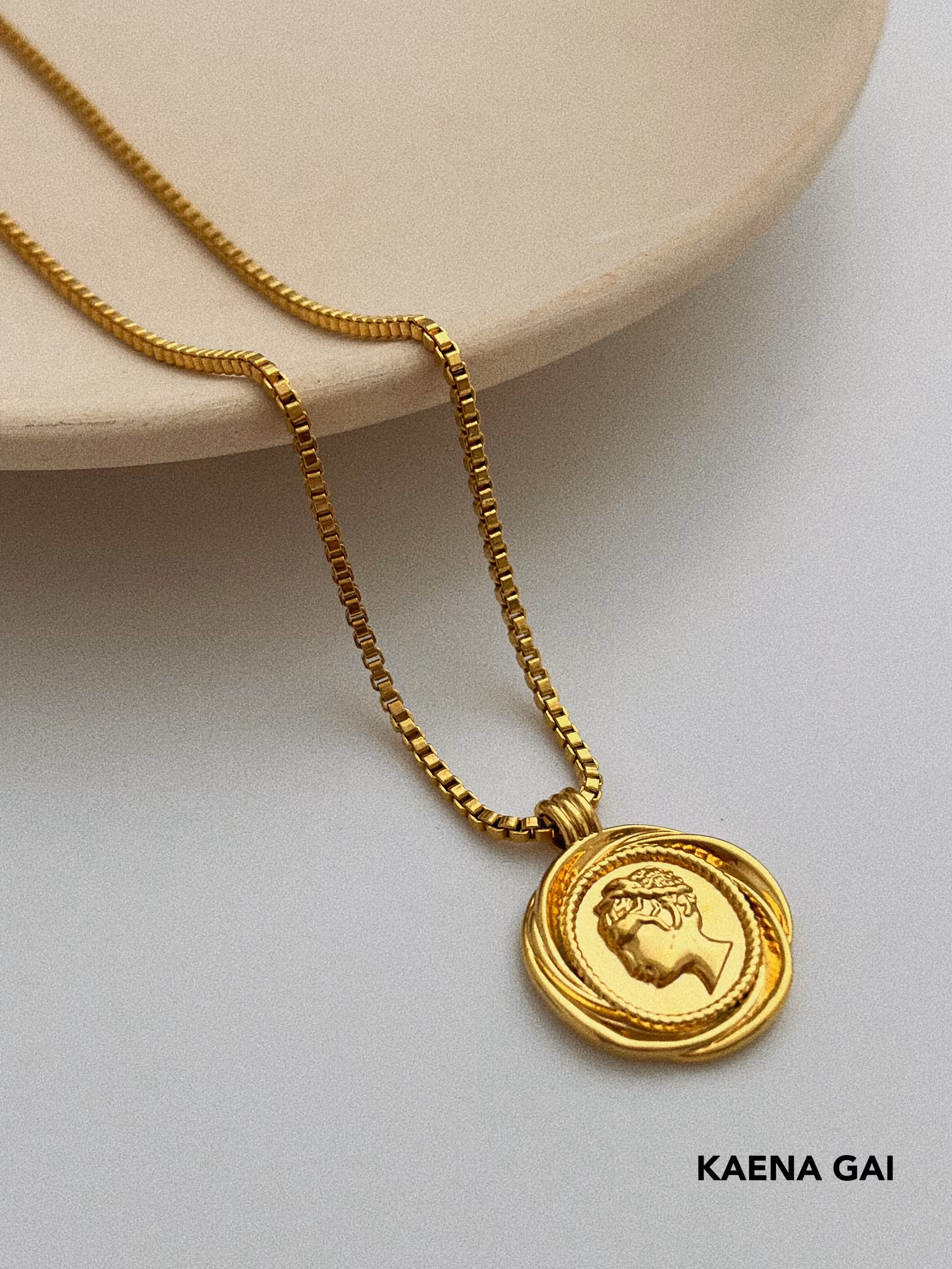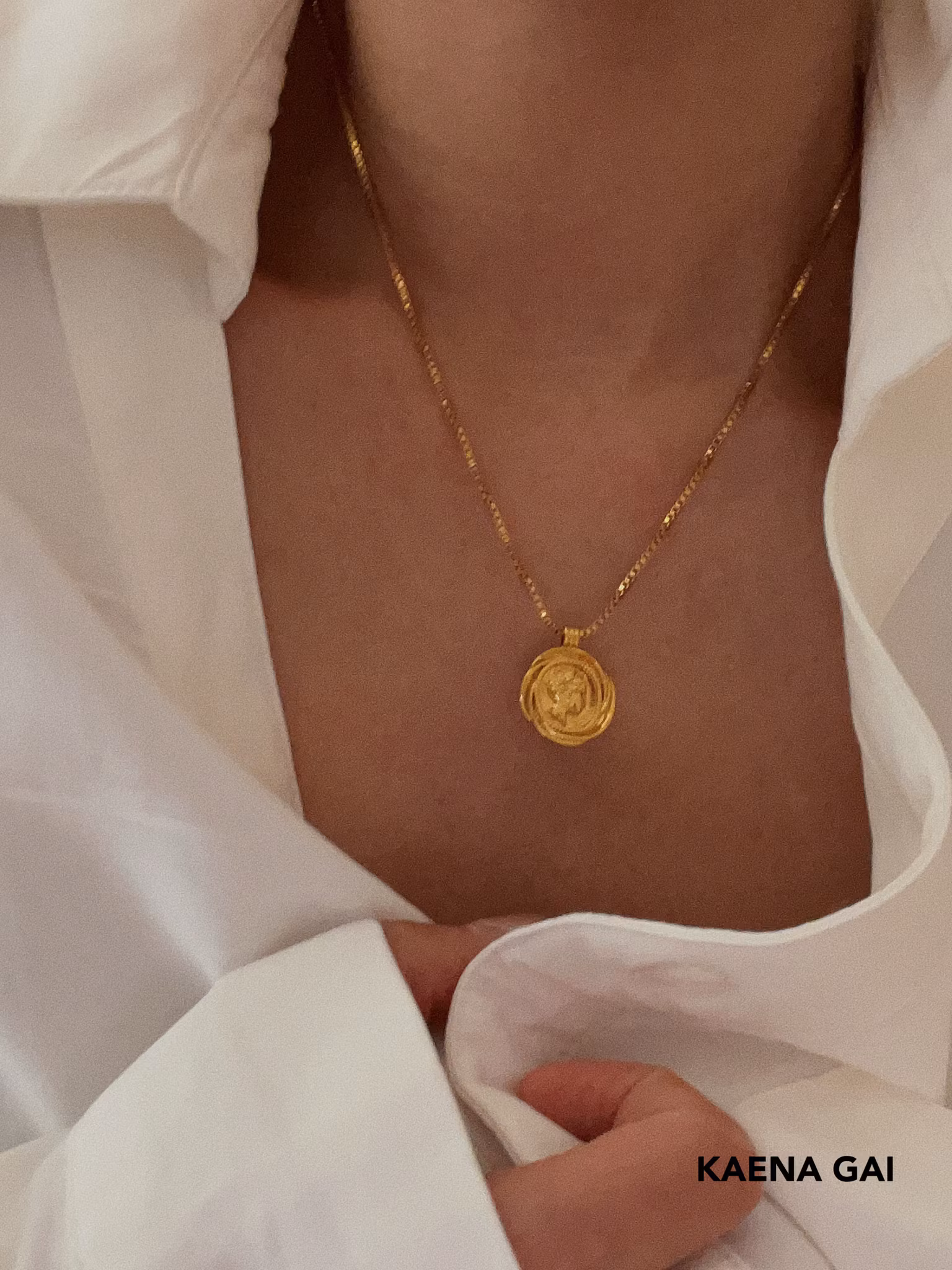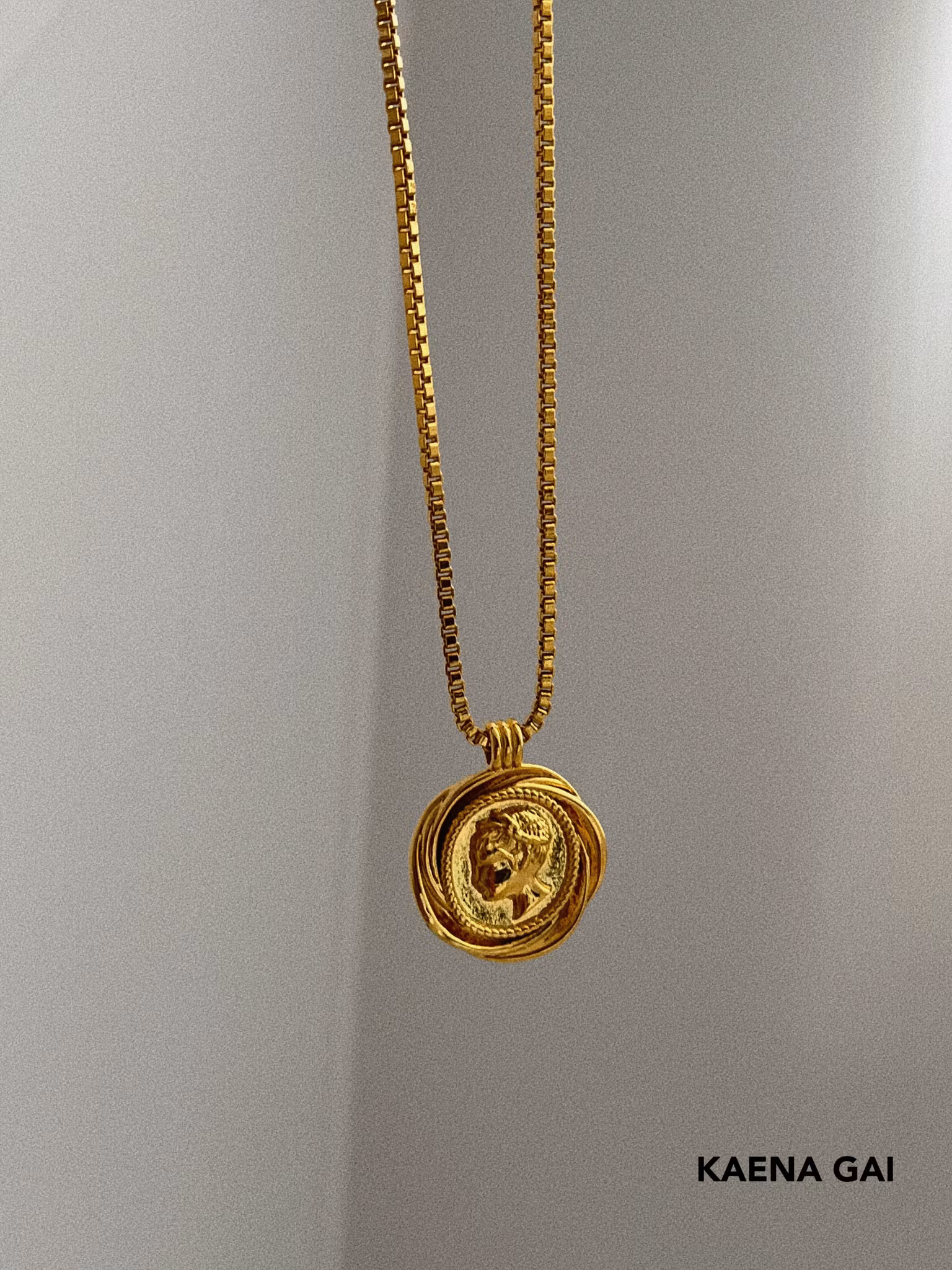 Ett 18K guldpläterat halsband med ett runt hänge och ett utsökt präglat huvud på hänget. Ett stilrent dekorativt halsband som passar för alla tillfällen. Kombinera med örhängen och andra smycken för att fullända looken.