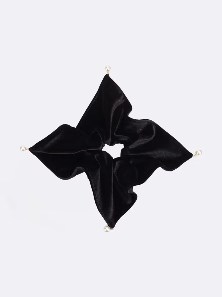 Stor scrunchie i svart sammetsimitation med dekorativ kant av vita pärlor.