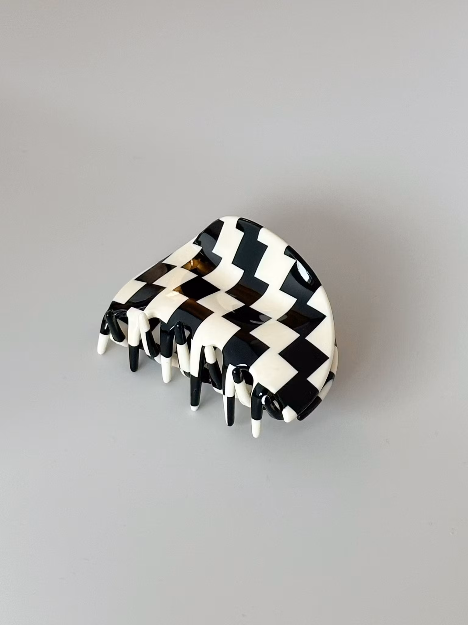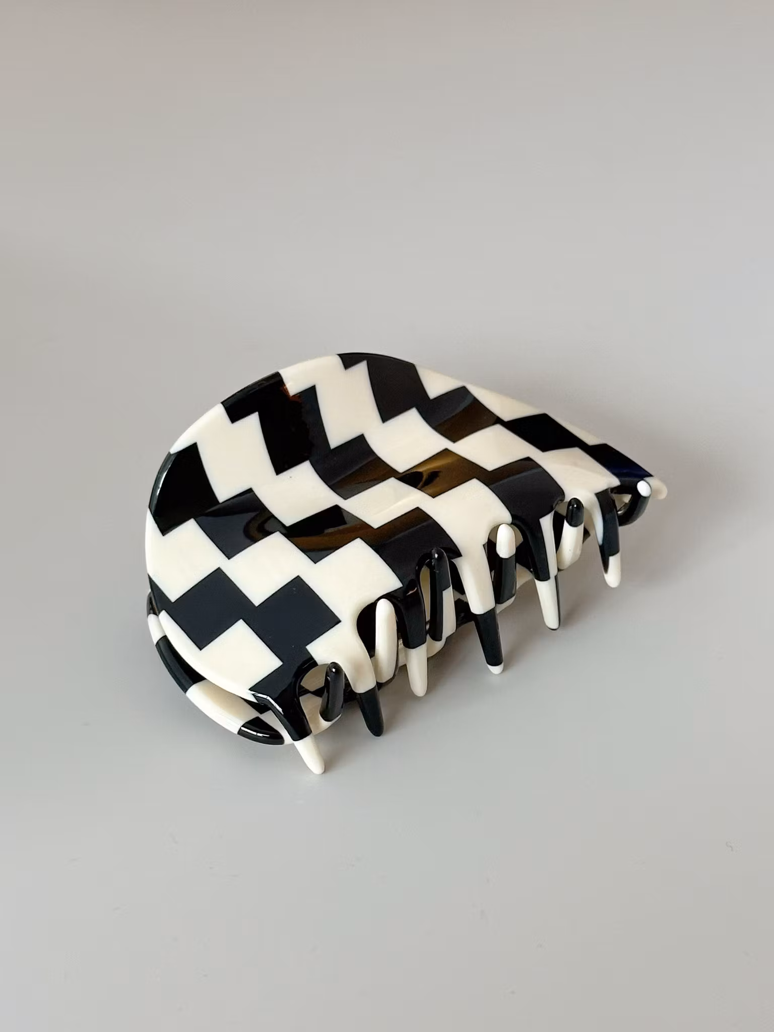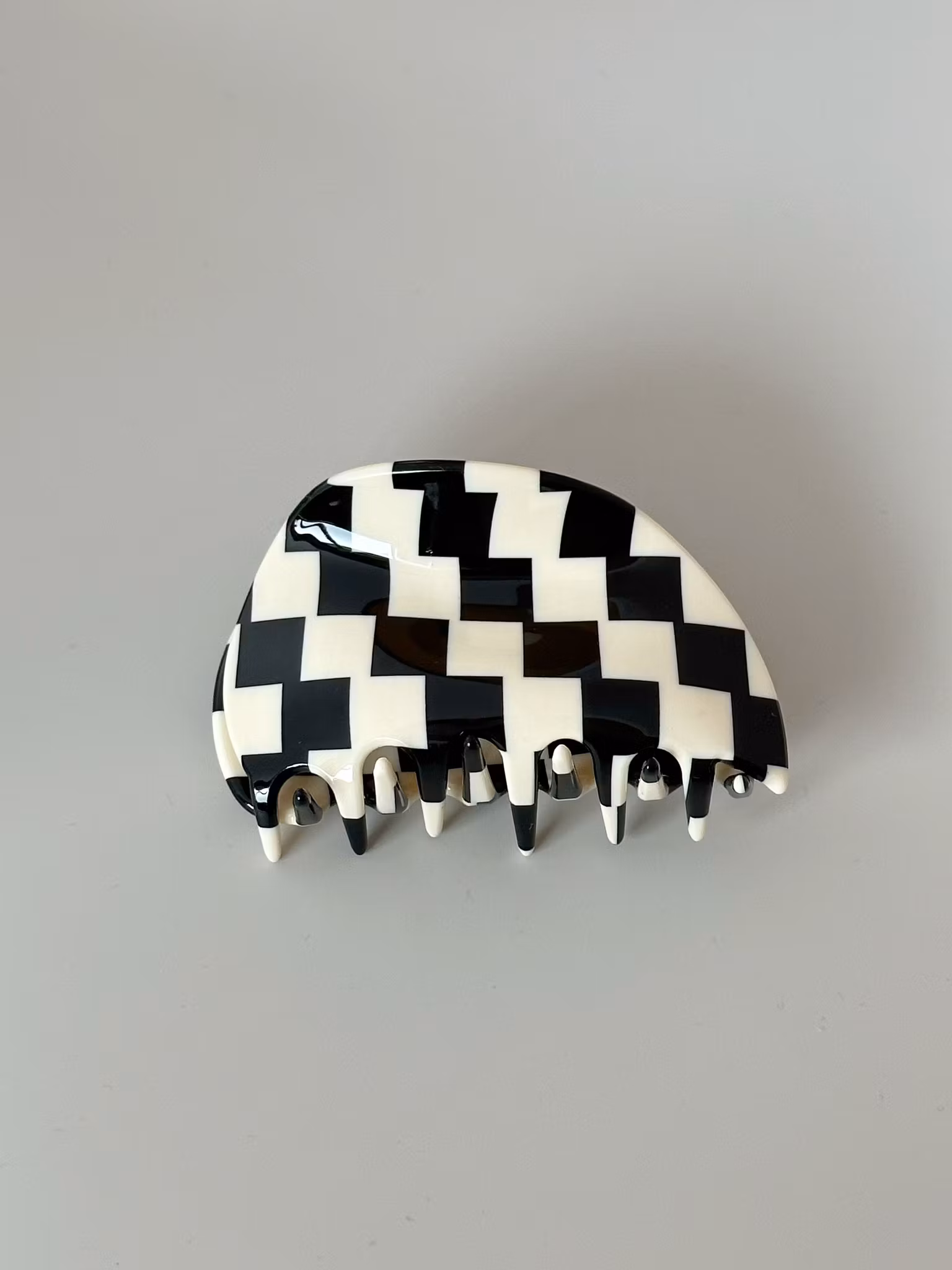 Hårklämma i svart och vitt rutigt mönster med lätt böjd form. Klassisk håraccessoar i härlig färg för en enkel och skonsam uppsättning. Funkar perfekt för både halv och heluppsättningar.