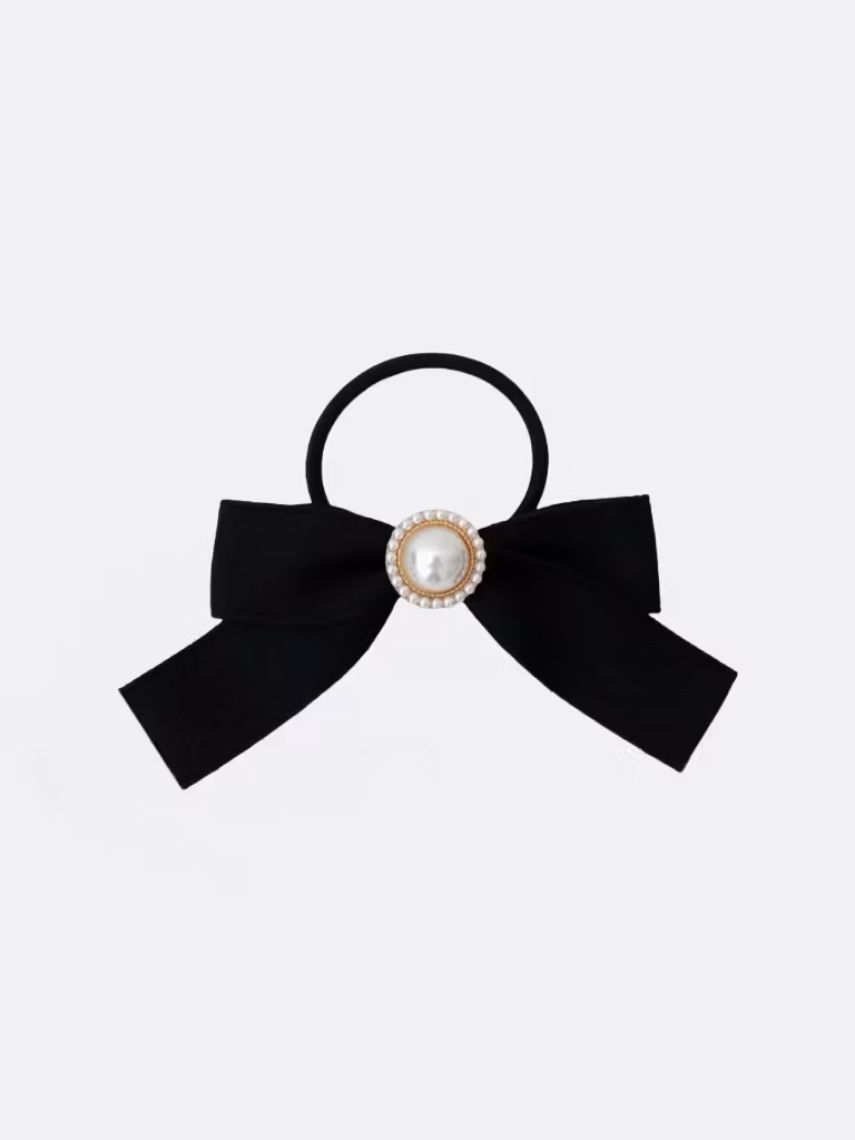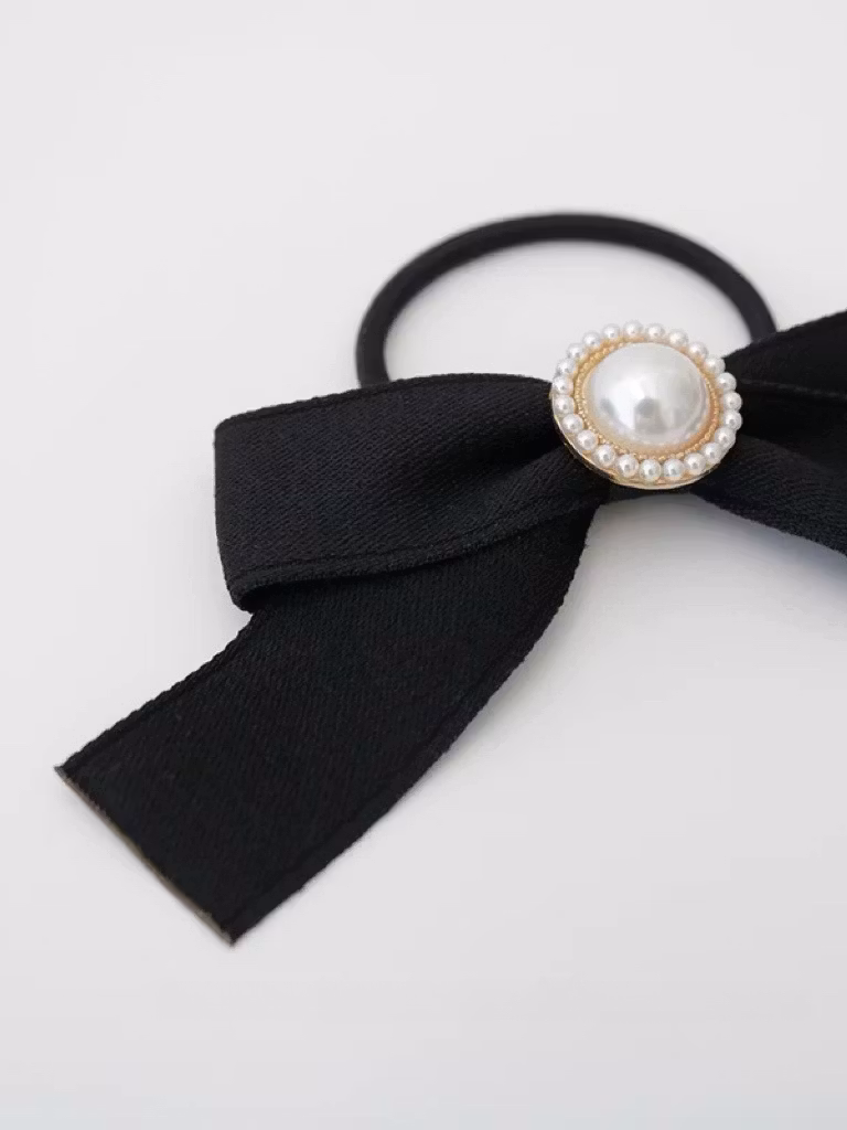 Hårsnoddar med stor rosett i svart sidenimitation. En dekorativ håraccessoar med glänsande tyg och vita pärlor som är en fin detalj till din frisyr. Detta är den perfekta håraccessoaren till säsongens alla tillställningar.