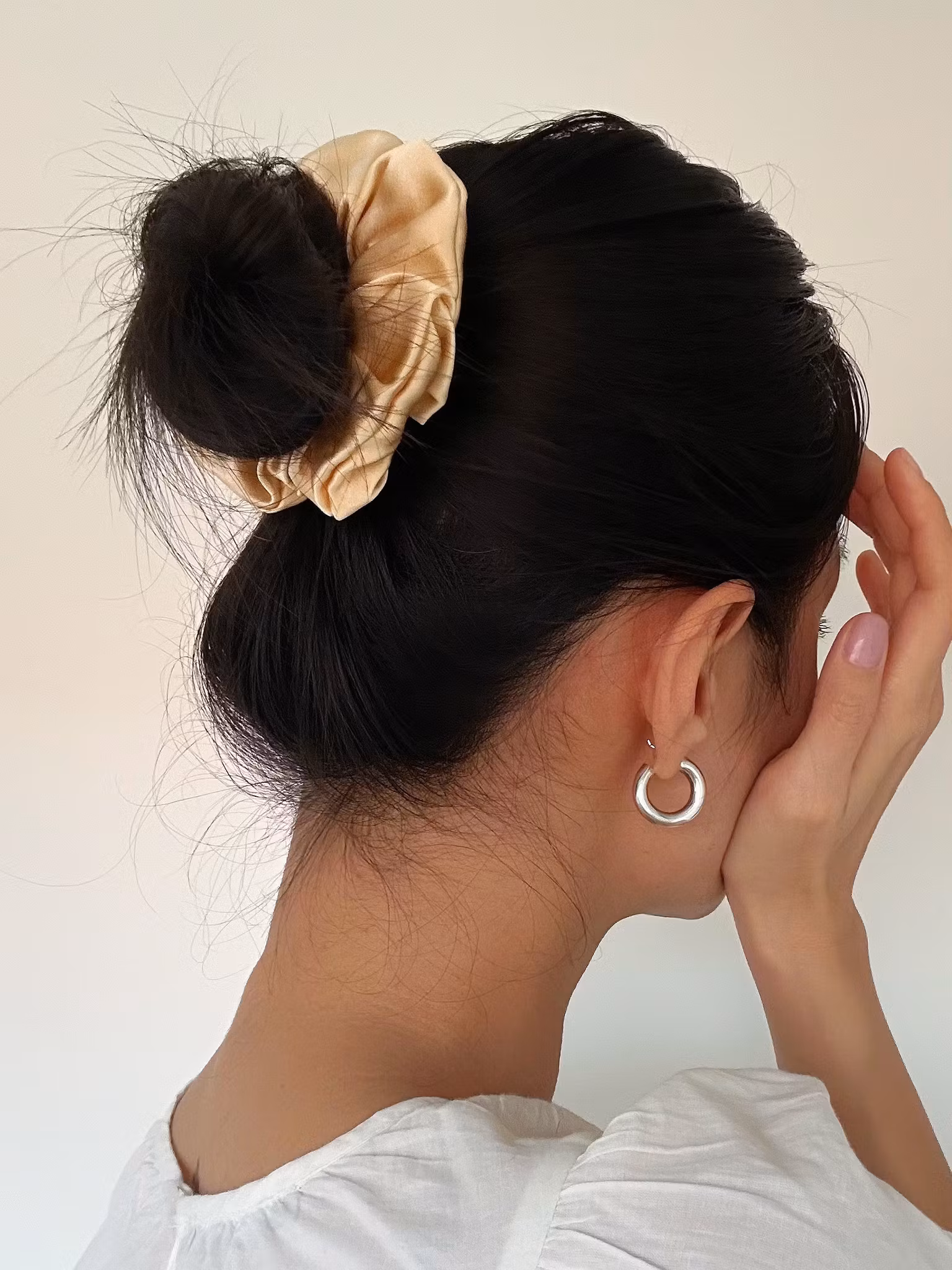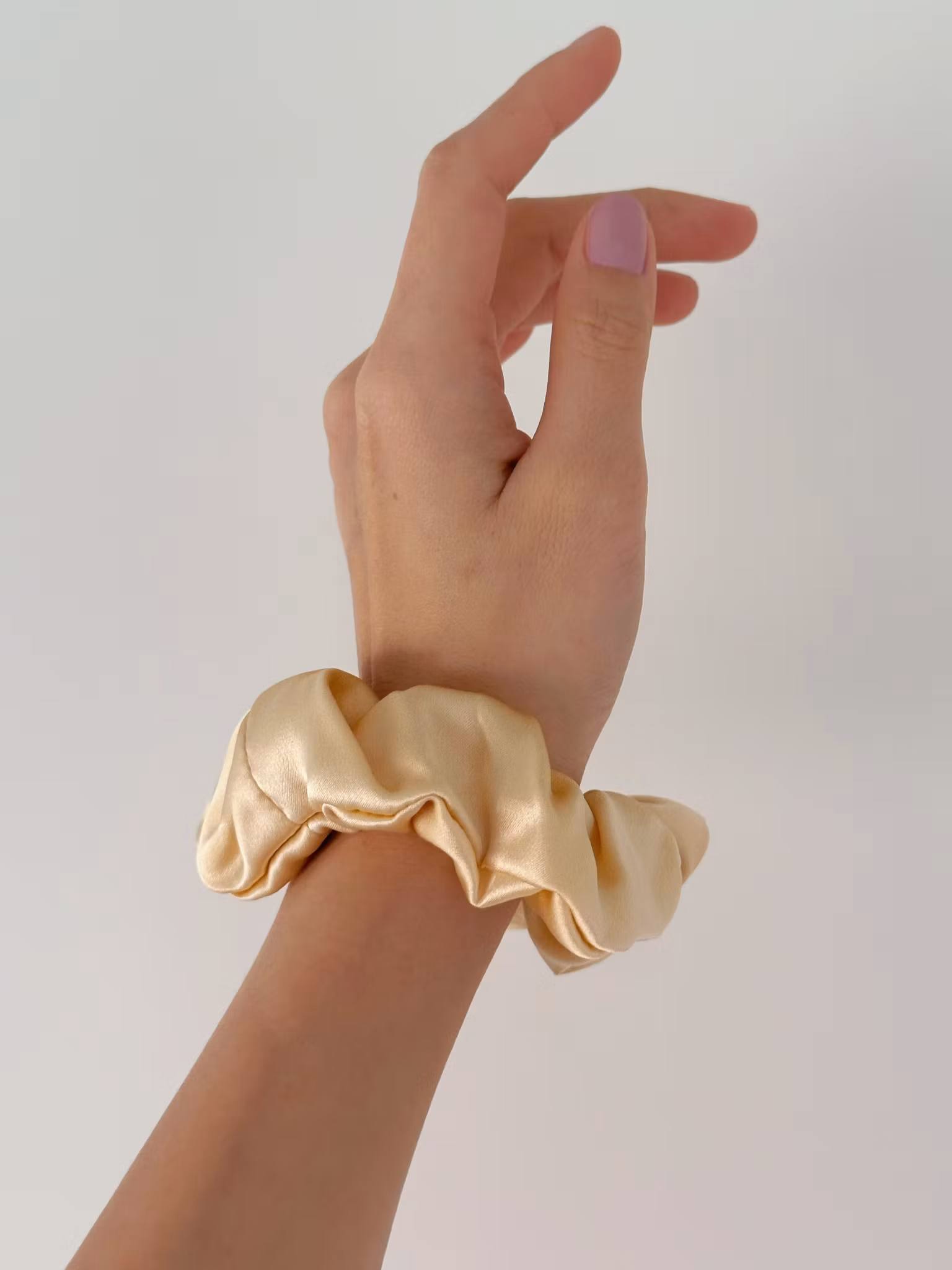 Vacker och tidlös scrunchie av 100 % mullbärssilke med en vikt på 19 momme - vilket är ett mått på silkets kvalitet och tjocklek. Ett smycke för håret utan att skava på det yttre lagret vilket främjar friskt hår. Motverkar märken och avtryck under uppsättningar.
