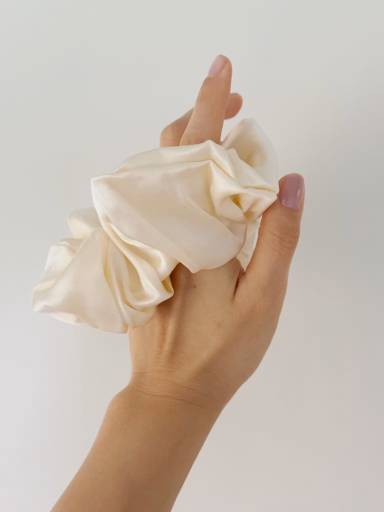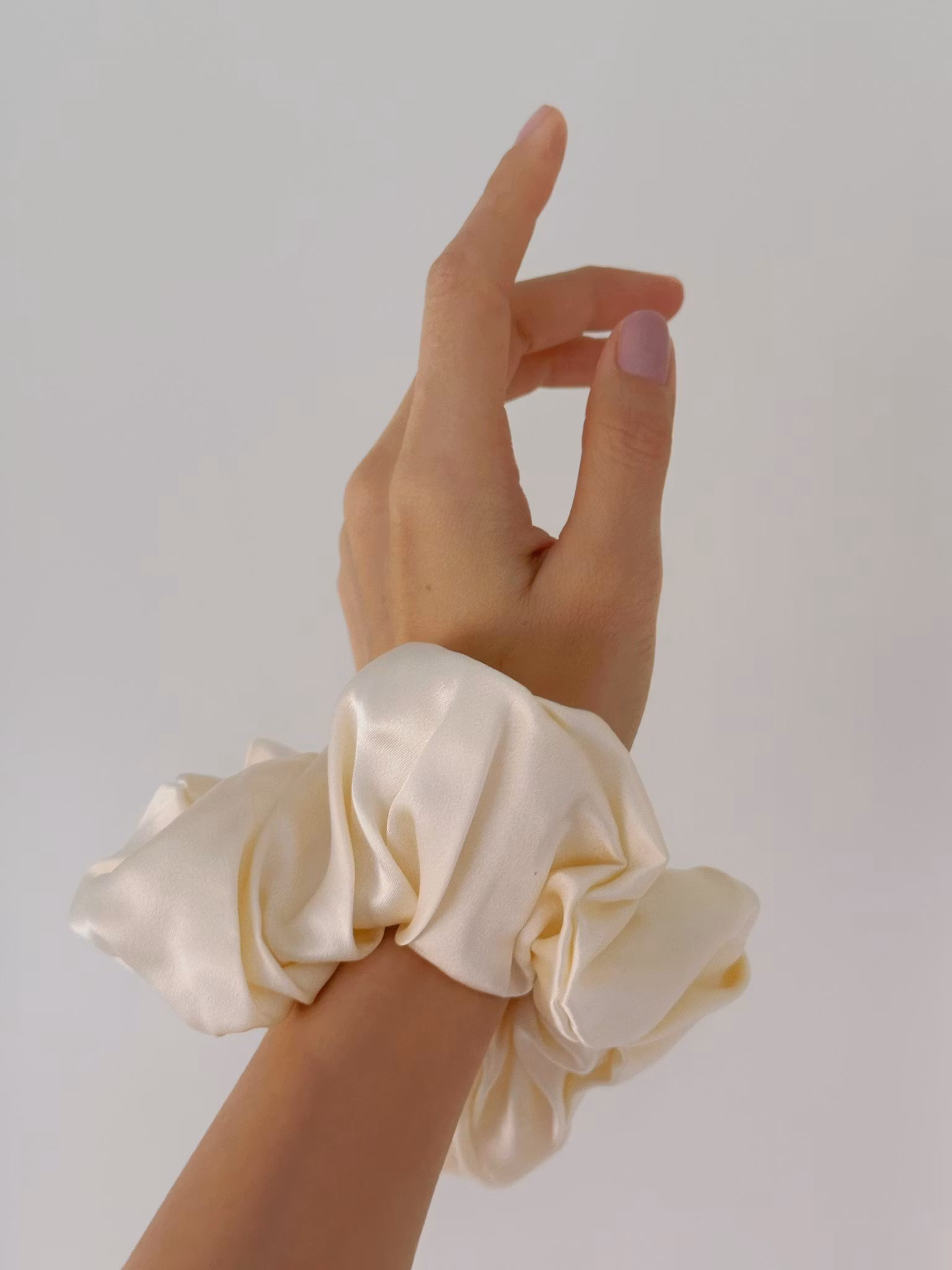 Vacker och tidlös scrunchie av 100 % mullbärssilke med en vikt på 19 momme - vilket är ett mått på silkets kvalitet och tjocklek. Ett smycke för håret utan att skava på det yttre lagret vilket främjar friskt hår. Motverkar märken och avtryck under uppsättningar.