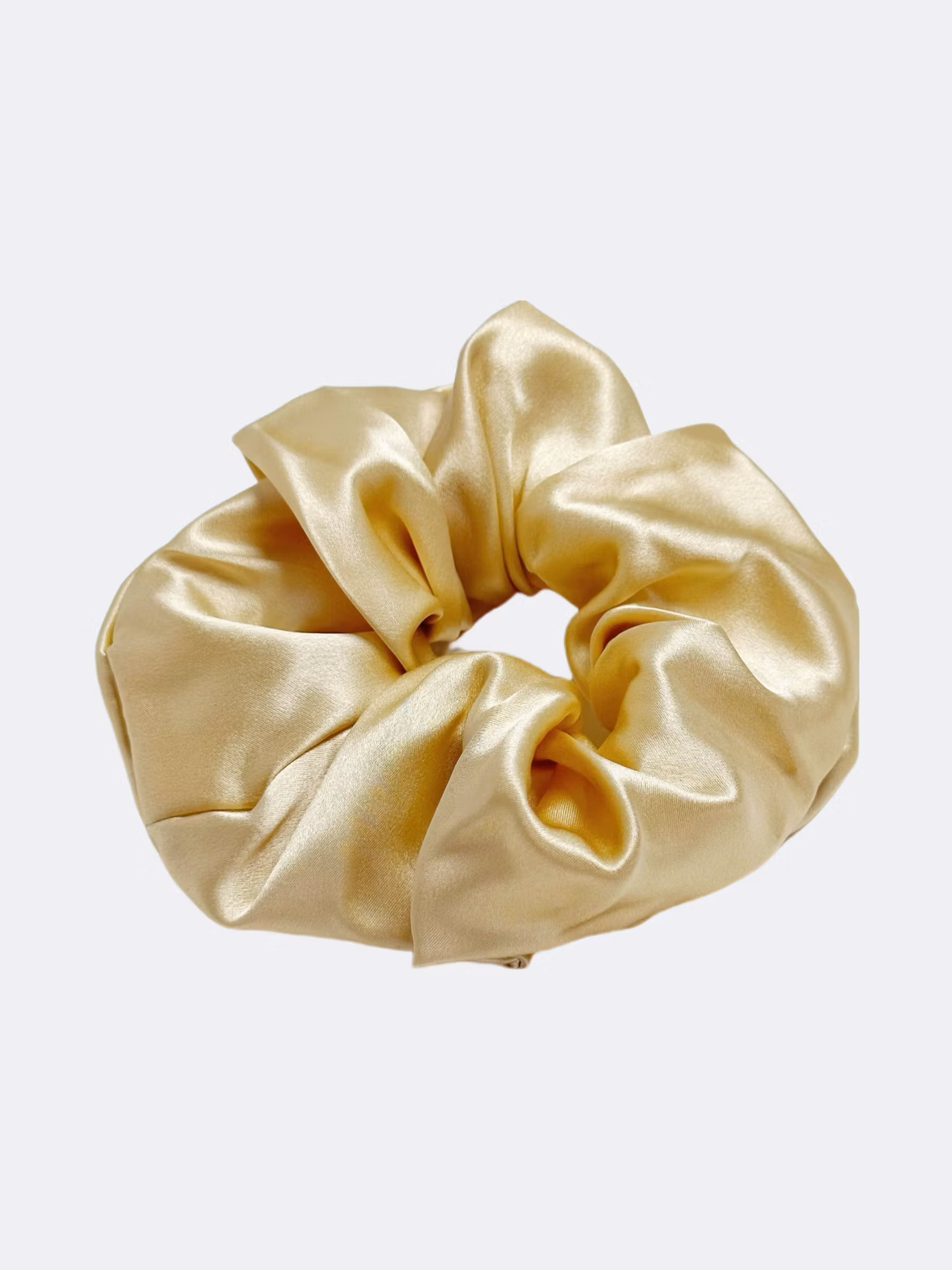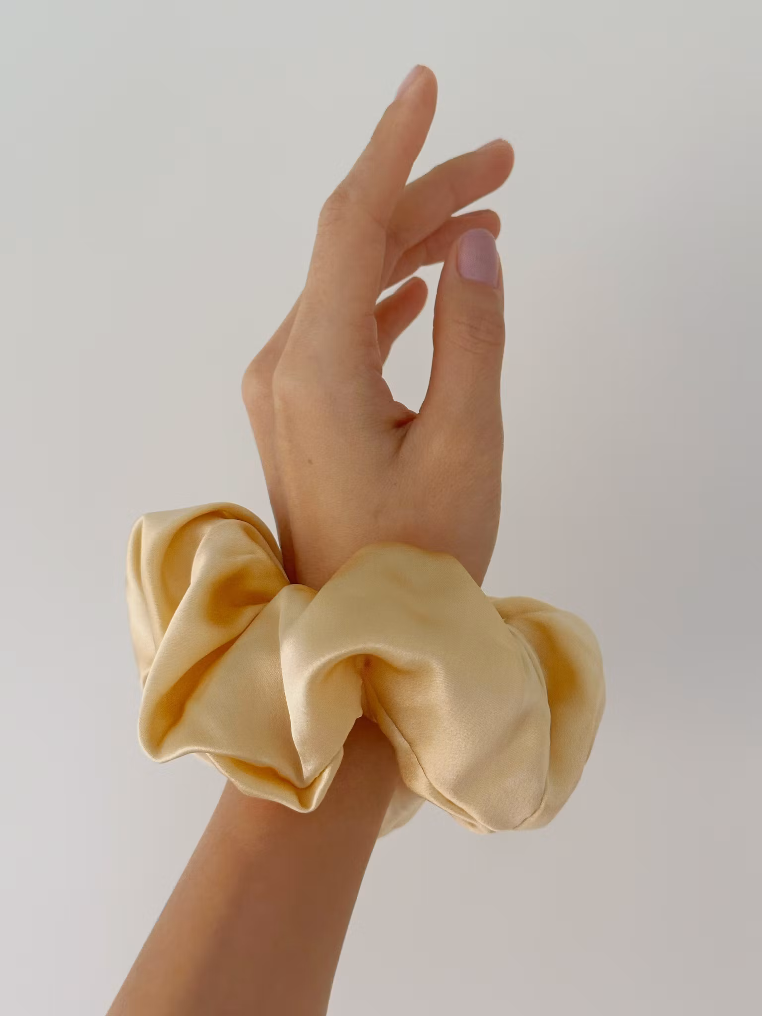 Vacker och tidlös scrunchie av 100 % mullbärssilke med en vikt på 19 momme - vilket är ett mått på silkets kvalitet och tjocklek. Ett smycke för håret utan att skava på det yttre lagret vilket främjar friskt hår. Motverkar märken och avtryck under uppsättningar.
