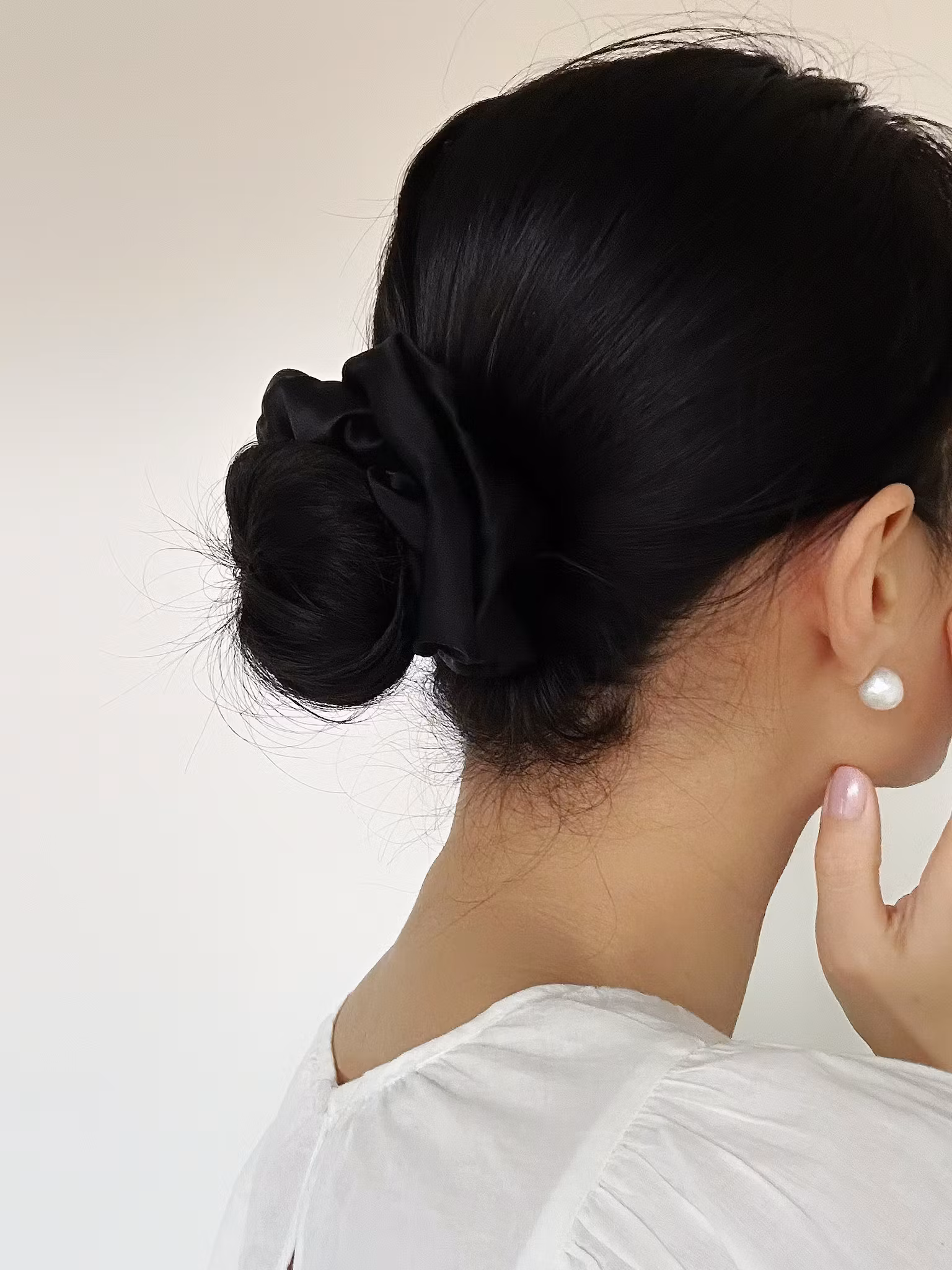 Vacker och tidlös scrunchie av 100 % mullbärssilke med en vikt på 19 momme - vilket är ett mått på silkets kvalitet och tjocklek. Ett smycke för håret utan att skava på det yttre lagret vilket främjar friskt hår. Motverkar märken och avtryck under uppsättningar.
