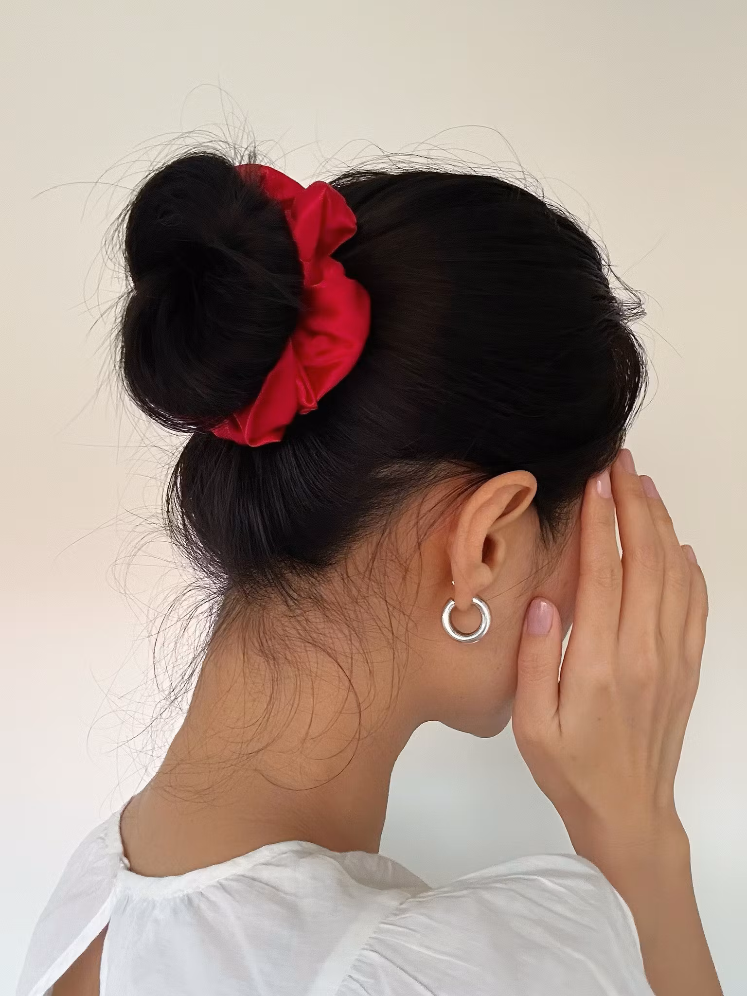 Vacker och tidlös scrunchie av 100 % mullbärssilke med en vikt på 19 momme - vilket är ett mått på silkets kvalitet och tjocklek. Ett smycke för håret utan att skava på det yttre lagret vilket främjar friskt hår. Motverkar märken och avtryck under uppsättningar.