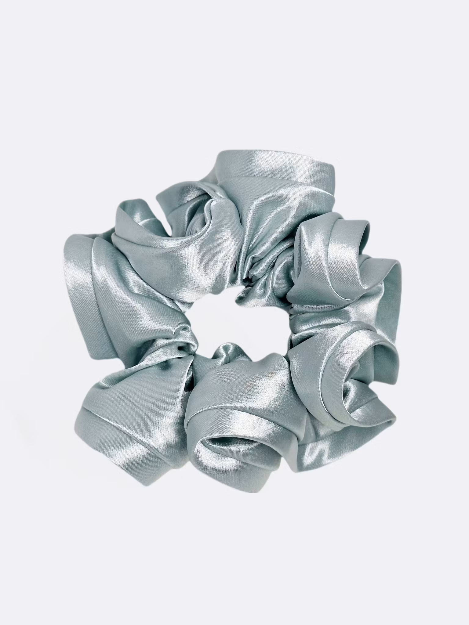 Stor pärlblå scrunchie i glansig sidenimitation. Fin håraccessoar med mycket volym som passar perfekt till exempelvis en låg hästsvans eller knut.