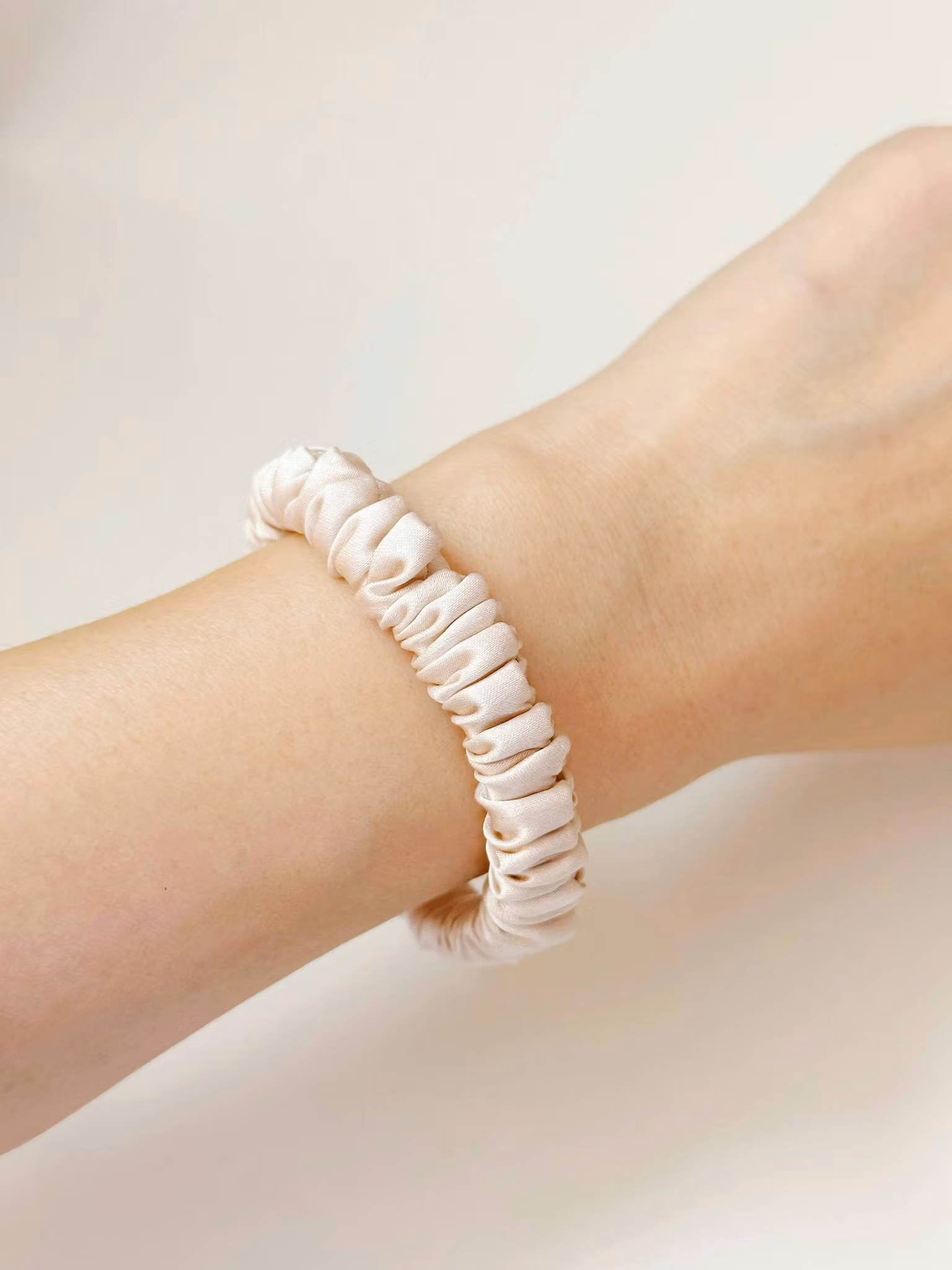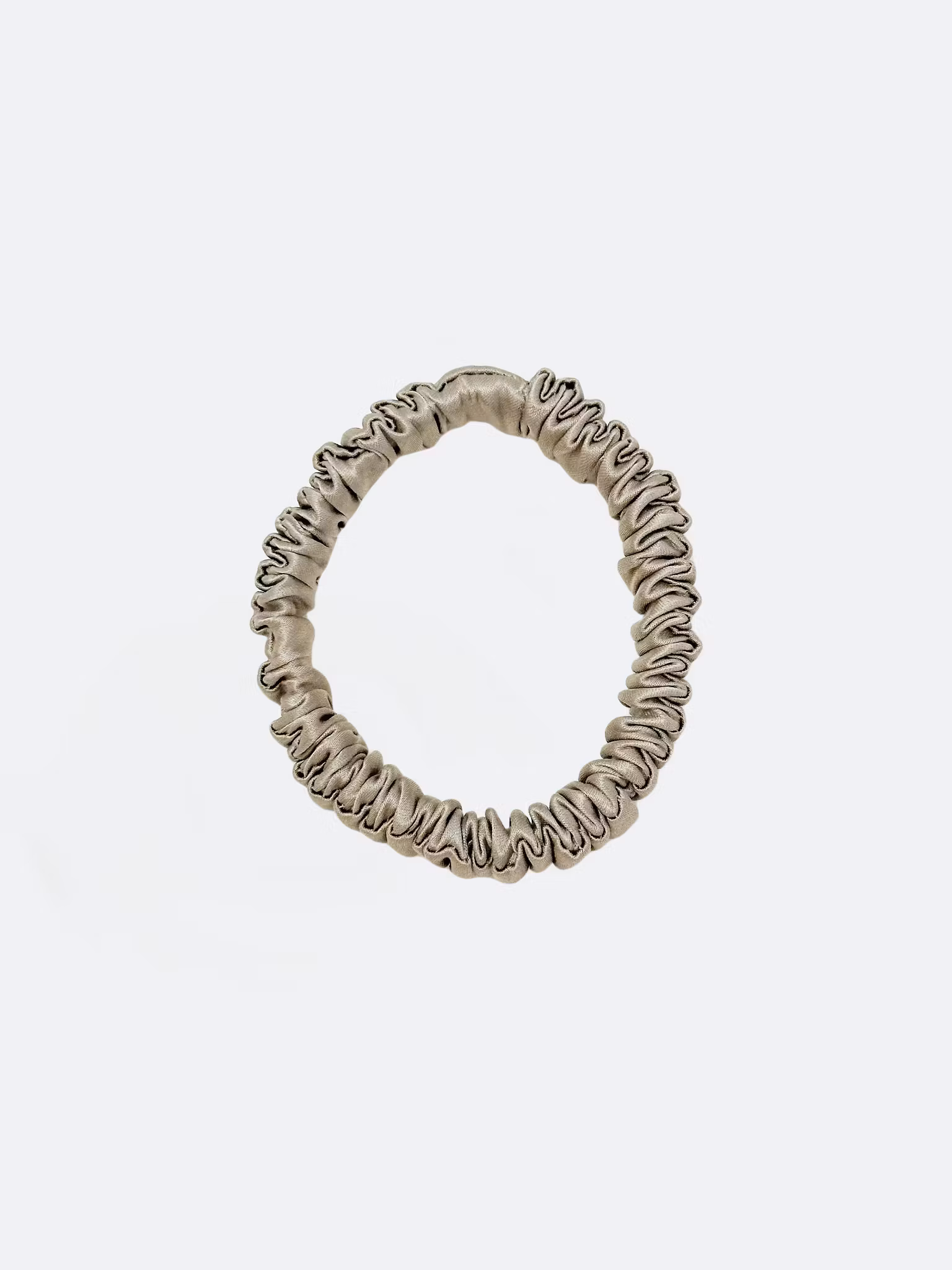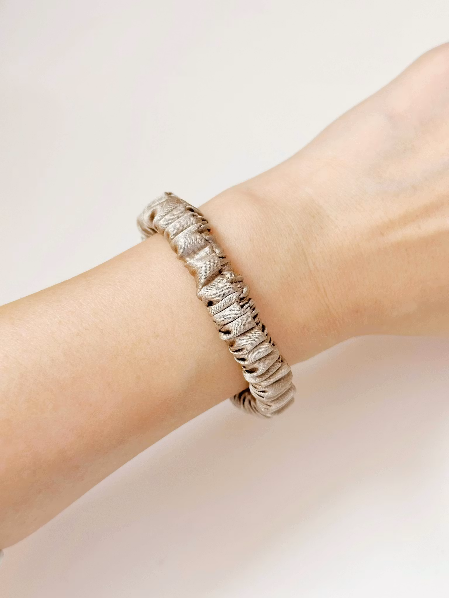 Vacker och tidlös scrunchie av 100 % mullbärssilke med en vikt på 19 momme - vilket är ett mått på silkets kvalitet och tjocklek. Ett smycke för håret utan att skava på det yttre lagret vilket främjar friskt hår. Motverkar märken och avtryck under uppsättningar.