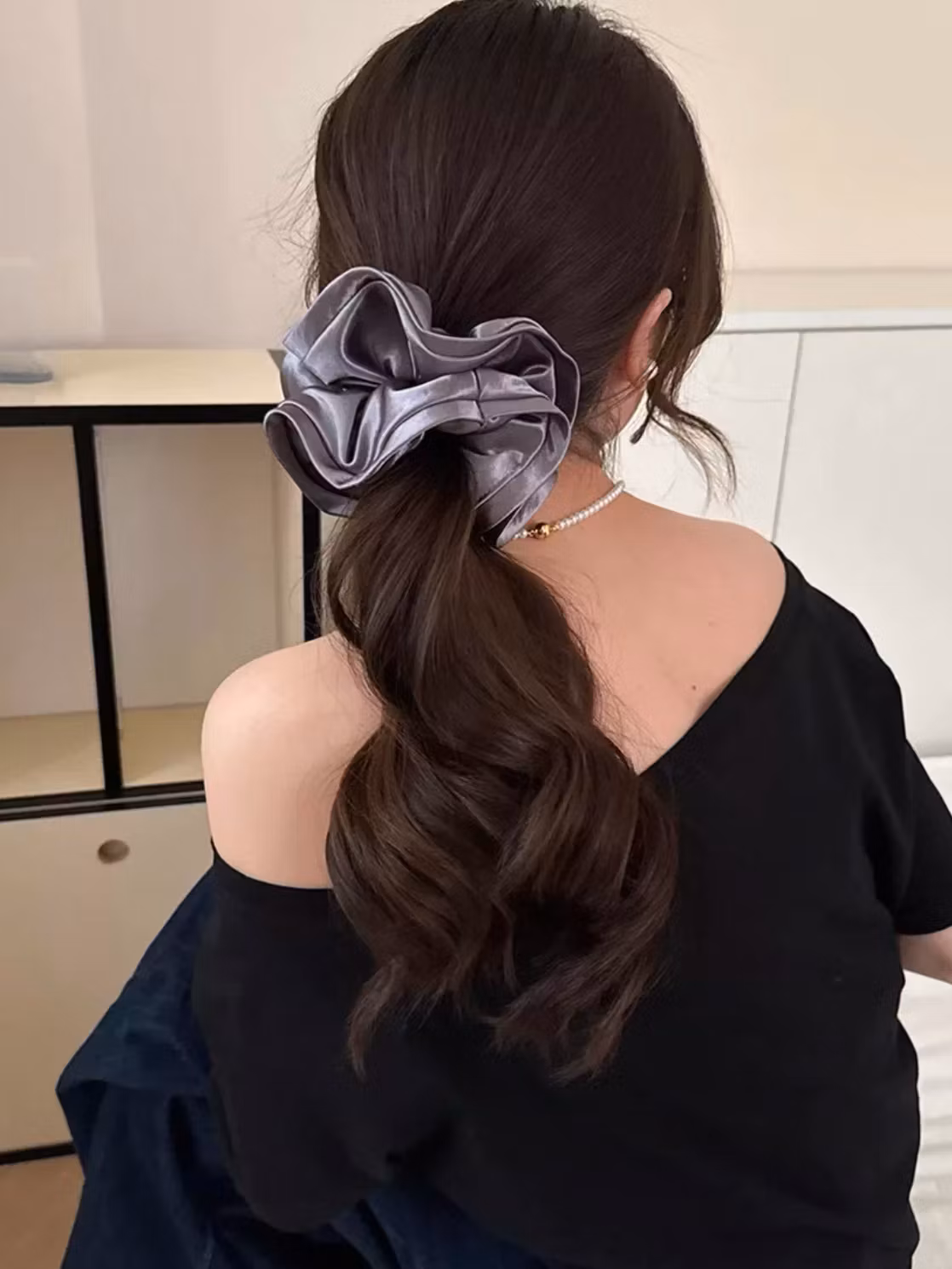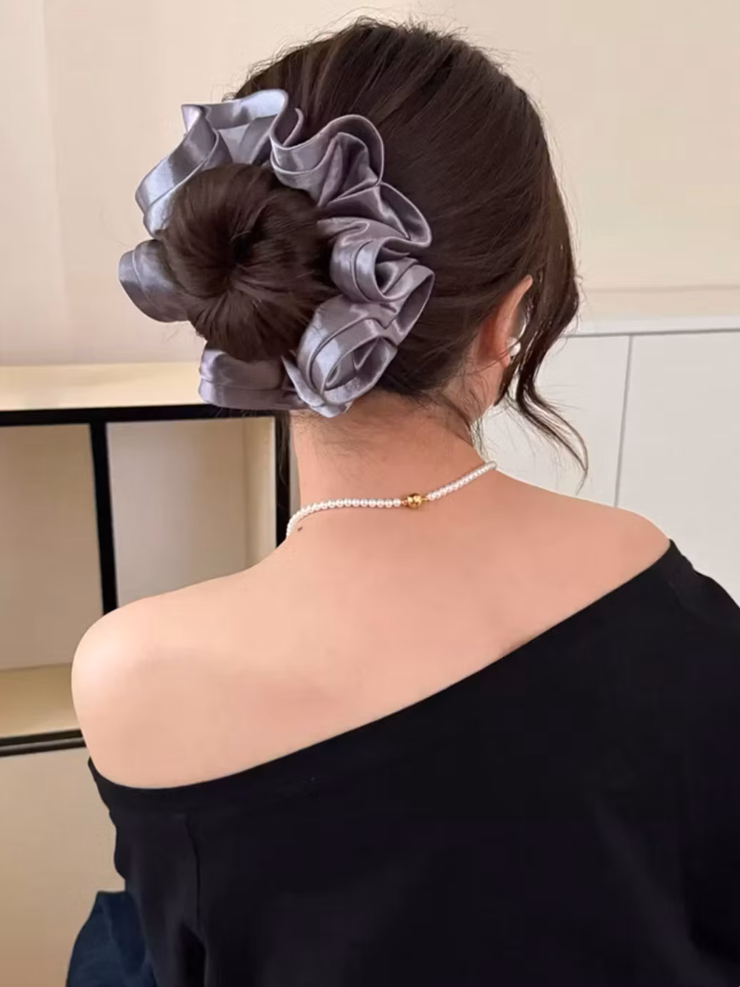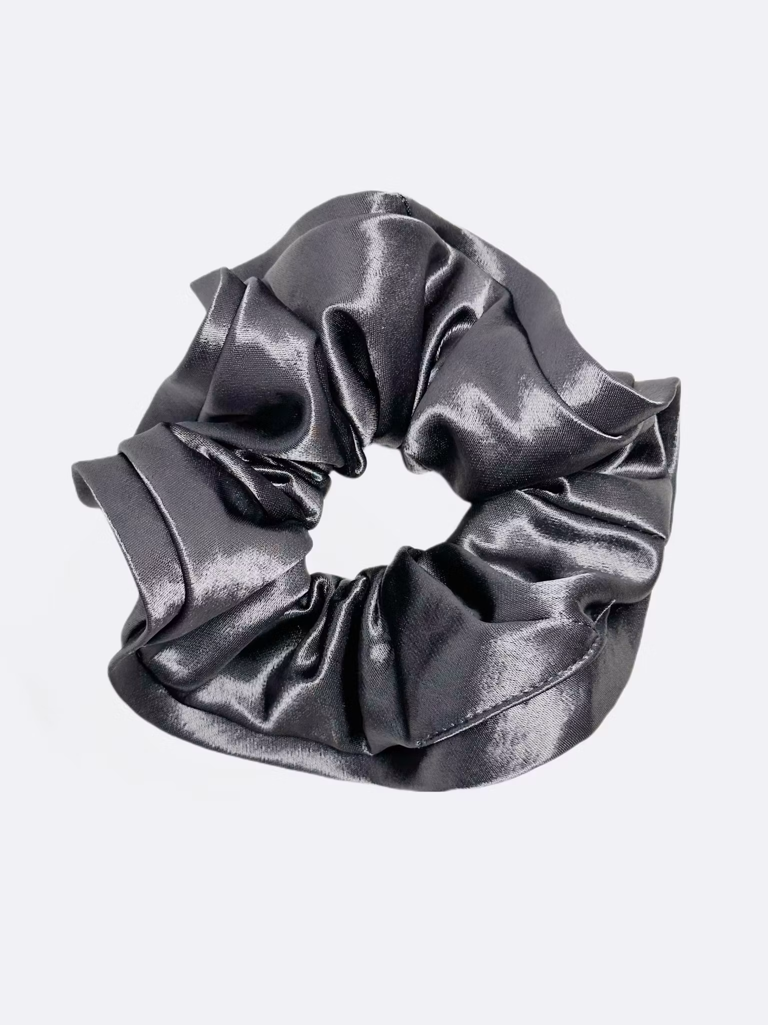 Stor pärlgrå scrunchie i glansig sidenimitation. Fin håraccessoar med mycket volym som passar perfekt till exempelvis en låg hästsvans eller knut.