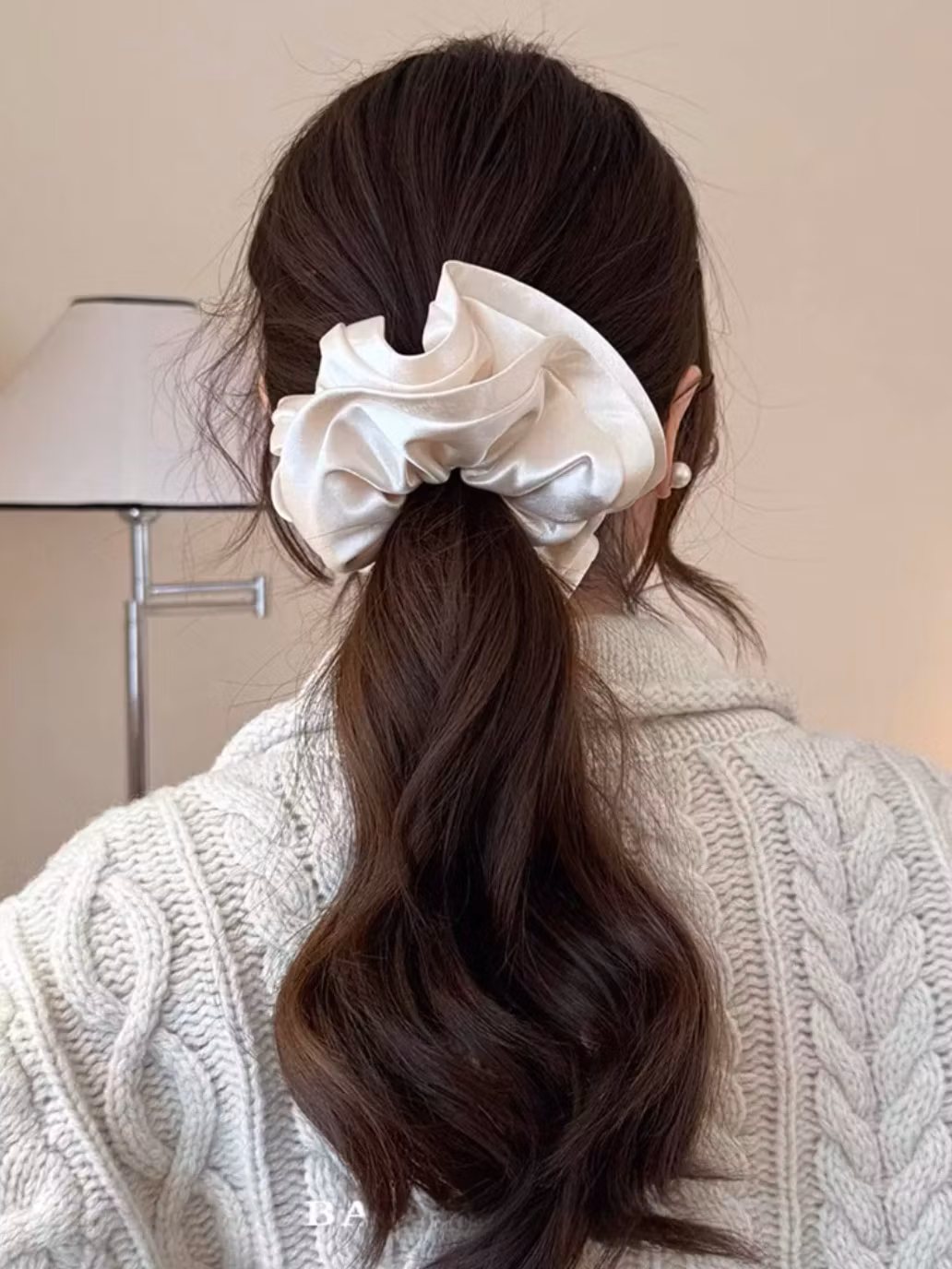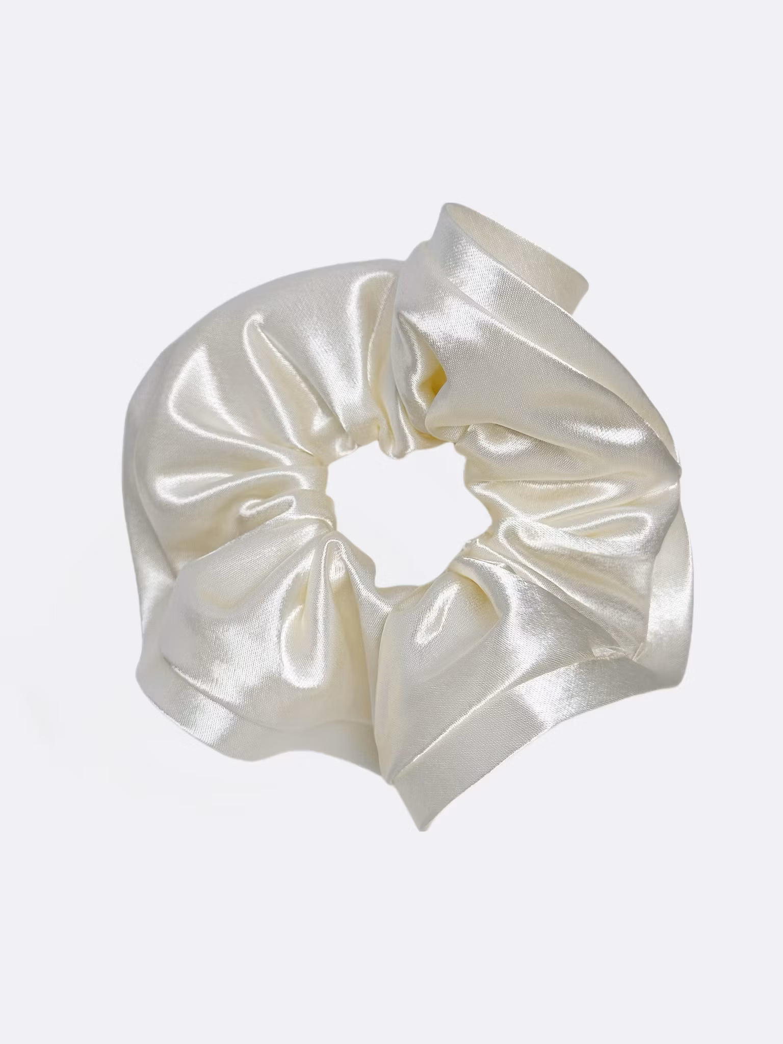 Stor pärlvit scrunchie i glansig sidenimitation. Fin håraccessoar med mycket volym som passar perfekt till exempelvis en låg hästsvans eller knut.