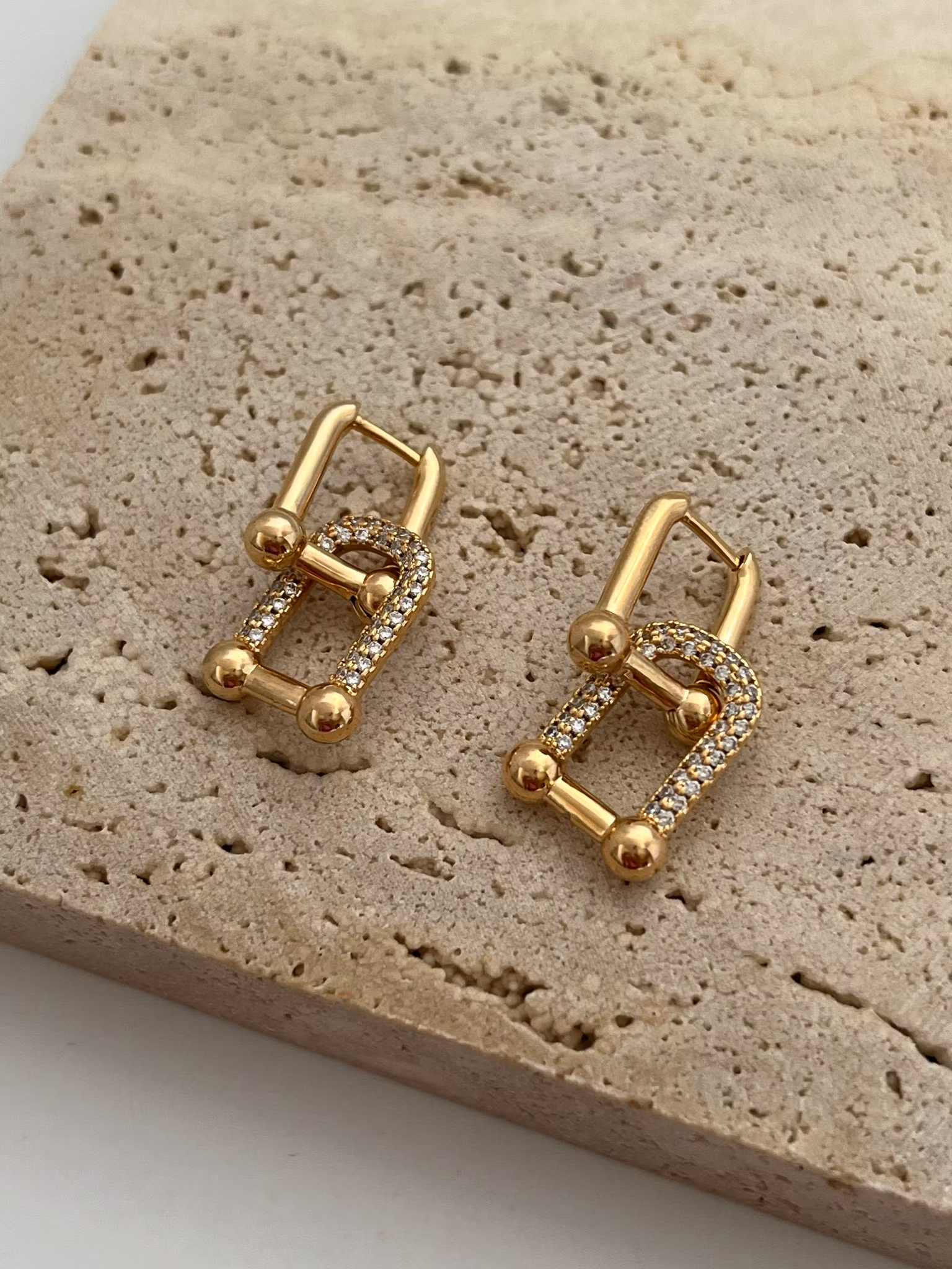 Högkvalitativ tjock guldplätering, långvarig färgbeständighet. Guldfärgade metallbågar med zirkonstenar på framsidan ger detta dekorativa par örhängen gnistan och färg till din look, perfekta för fest.