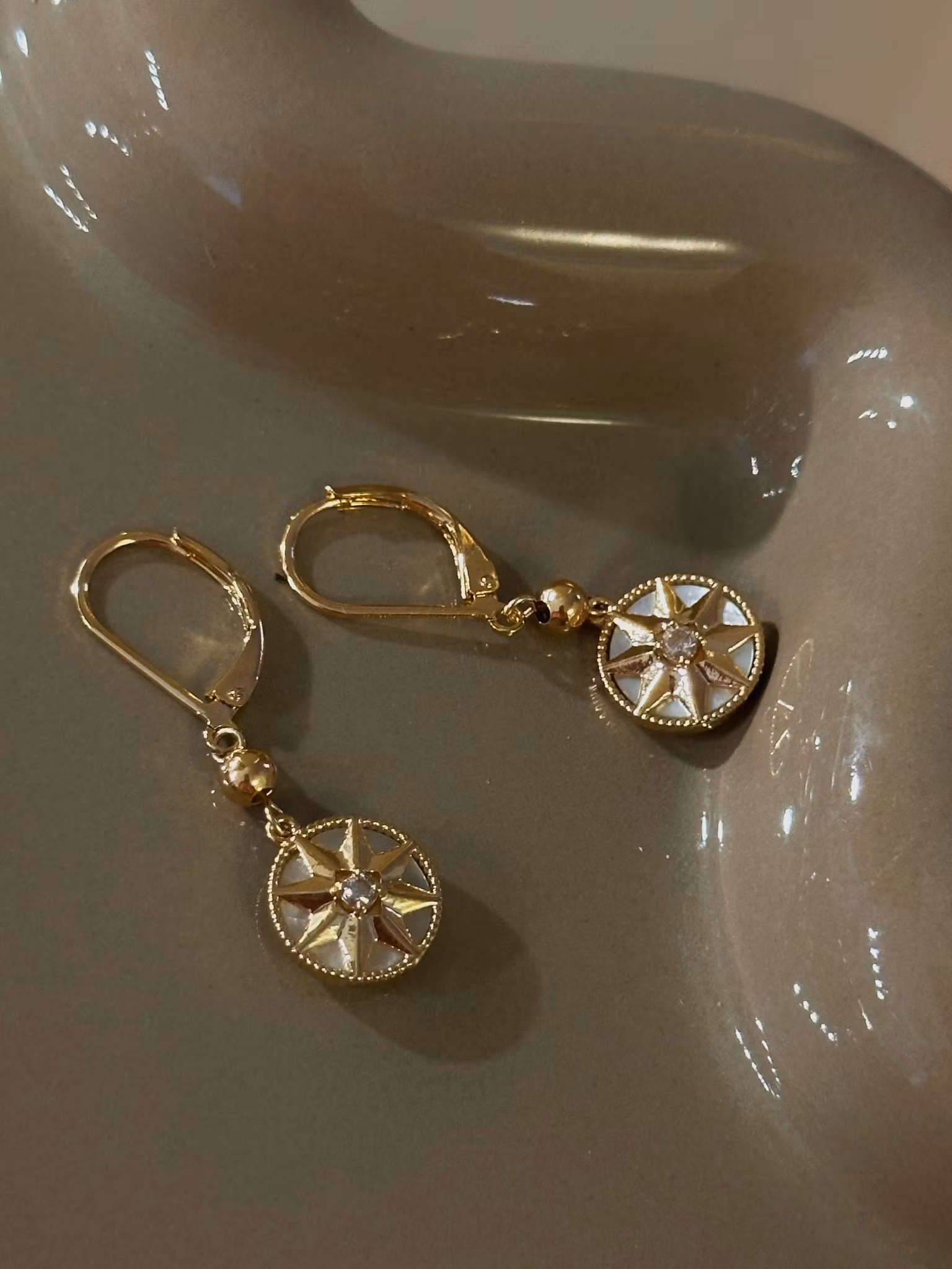 Små hoops i guldfärgad metall med runda mönstrande hängen. Vändbar design, med ett sexuddigt stjärnmönster utsmyckat med vit glasstenar på framsidan och ett glansigt skal på baksidan.