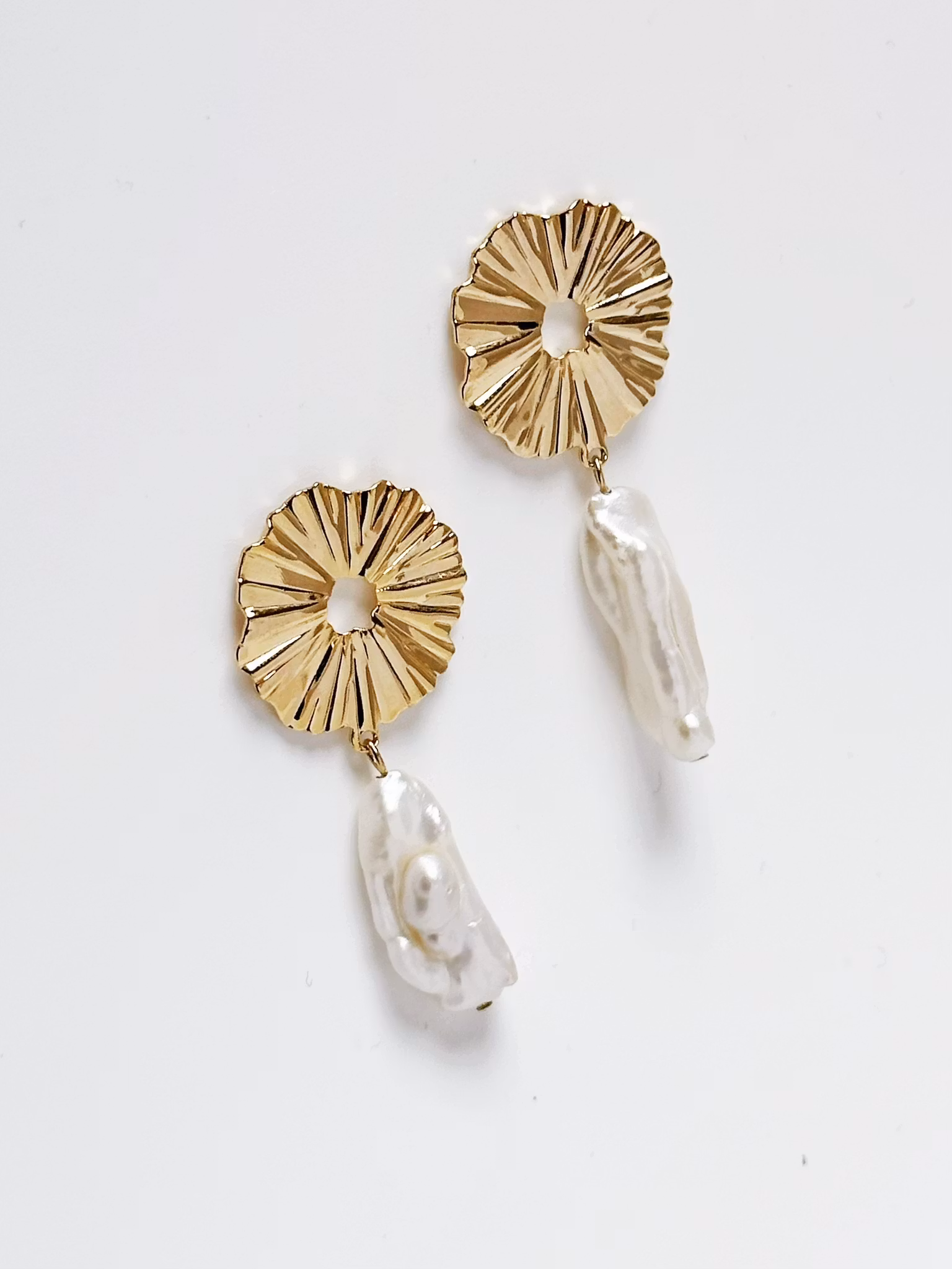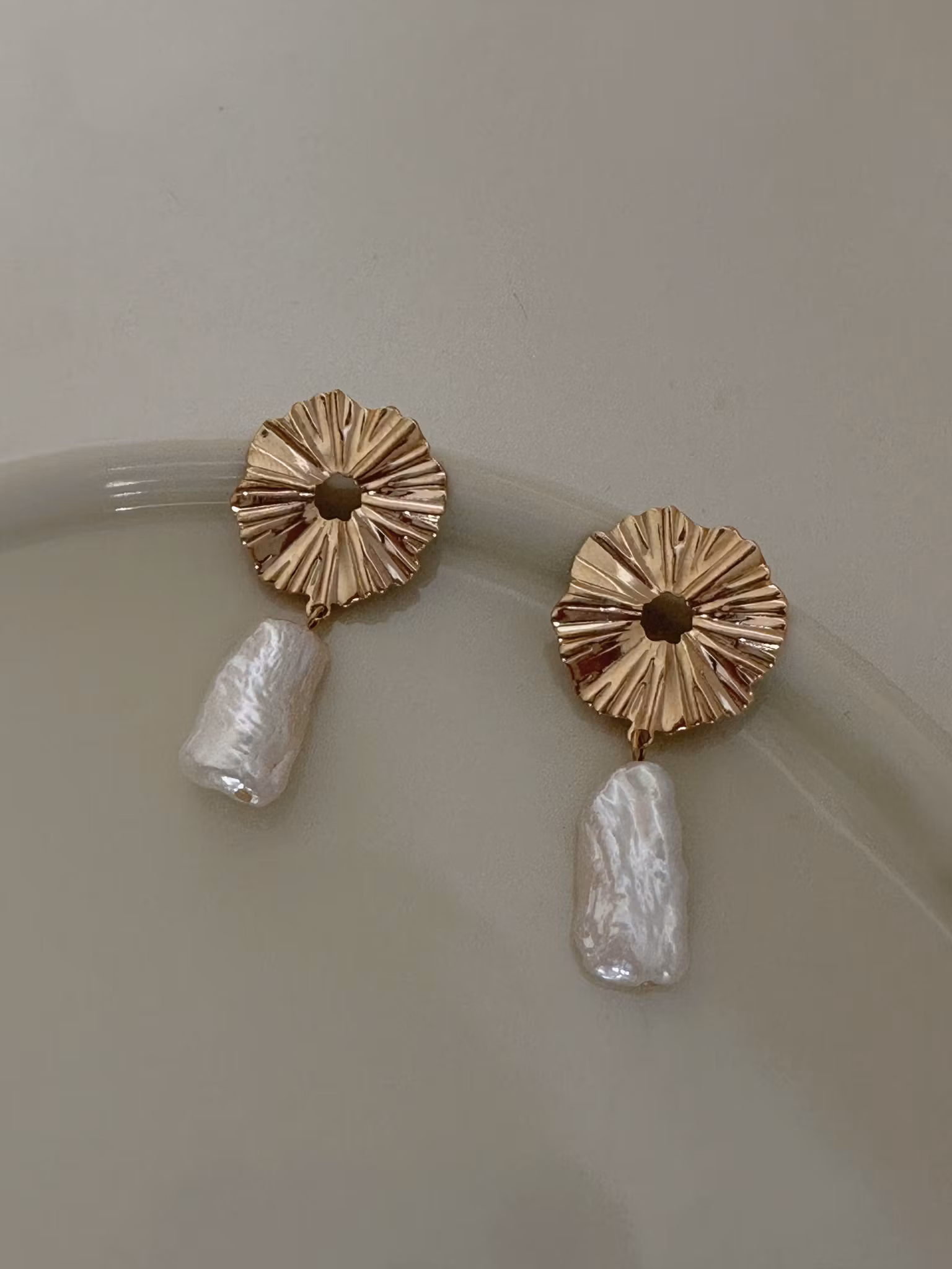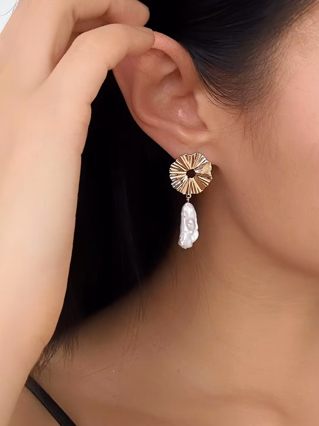 Handplockade parade sötvattenspärlor, parade med guldfjäderformade örhängen, unika och nischade, lämpliga för fest.
