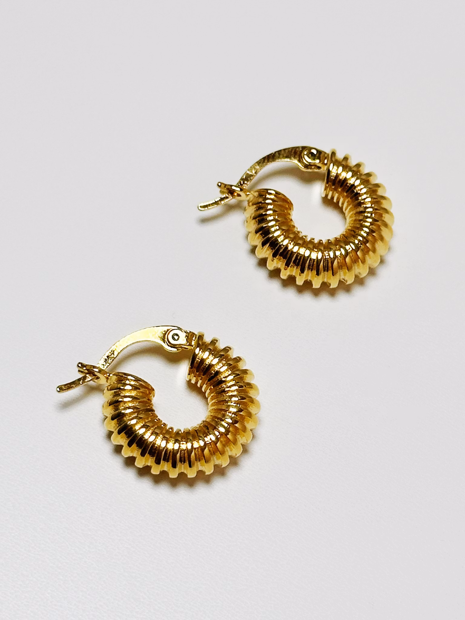 Chunky hoops i 18K guldpläterad med räfflad design. Ett par minimalistiska hoops med retrokänsla. Perfekt storlek för ett par everyday örhängen men med ett dekorativt mönster som bidrar med en intressant detalj till din outfit.