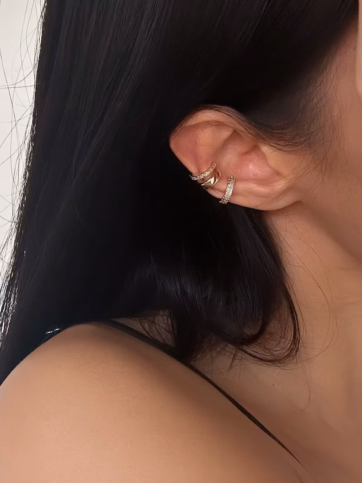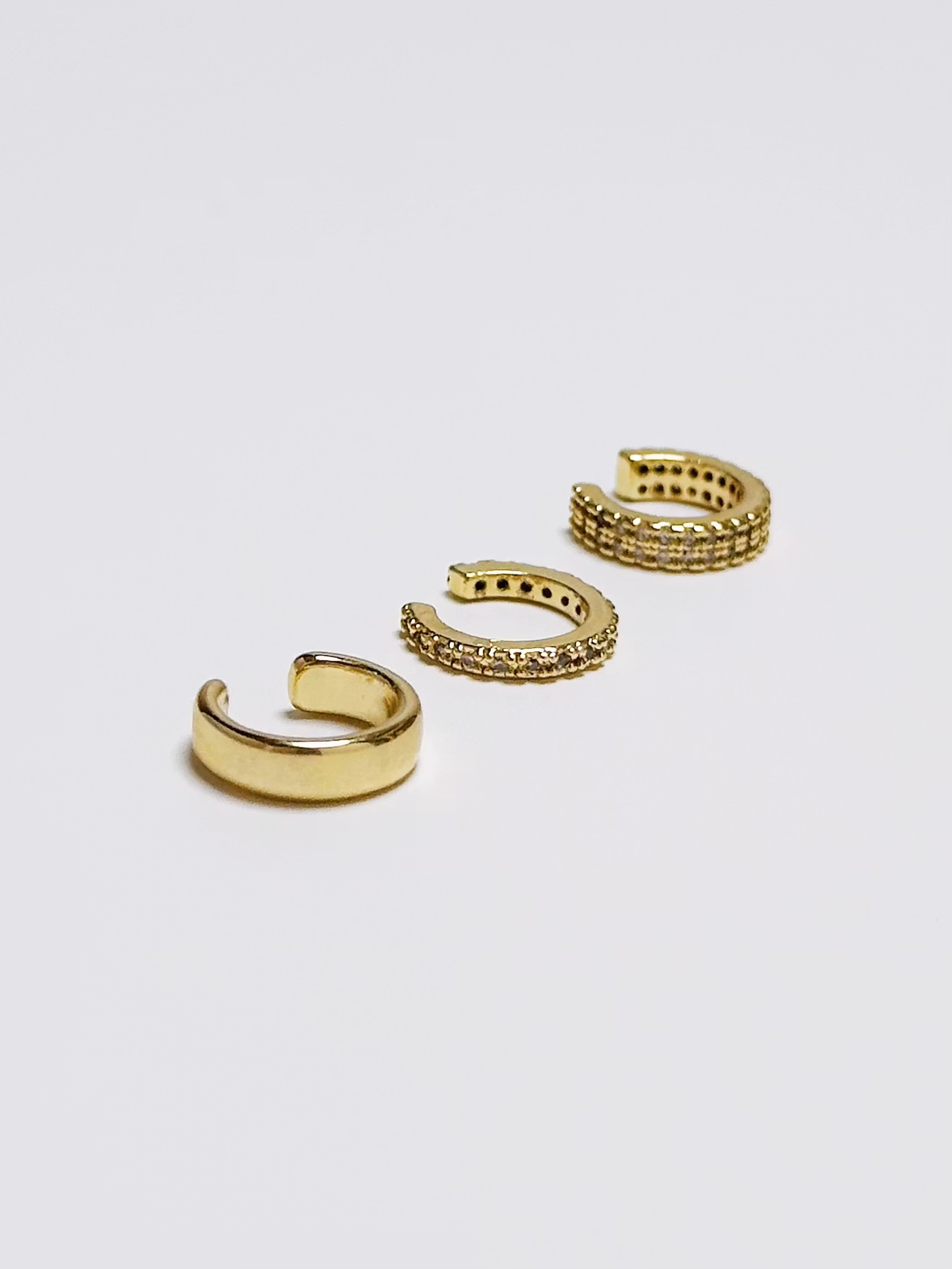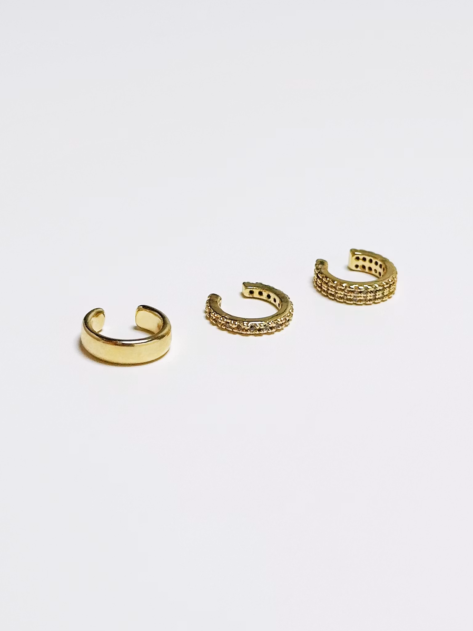 3-pack earcuffs i metall i bred design med dekorativa små glasstenar på två av dem. Earcuffen ger en illusion av flera piercings utan att du behöver ha ett hål i örat och är en snygg detalj som du enkelt kan sätta på örat genom att du klämmer fast det.