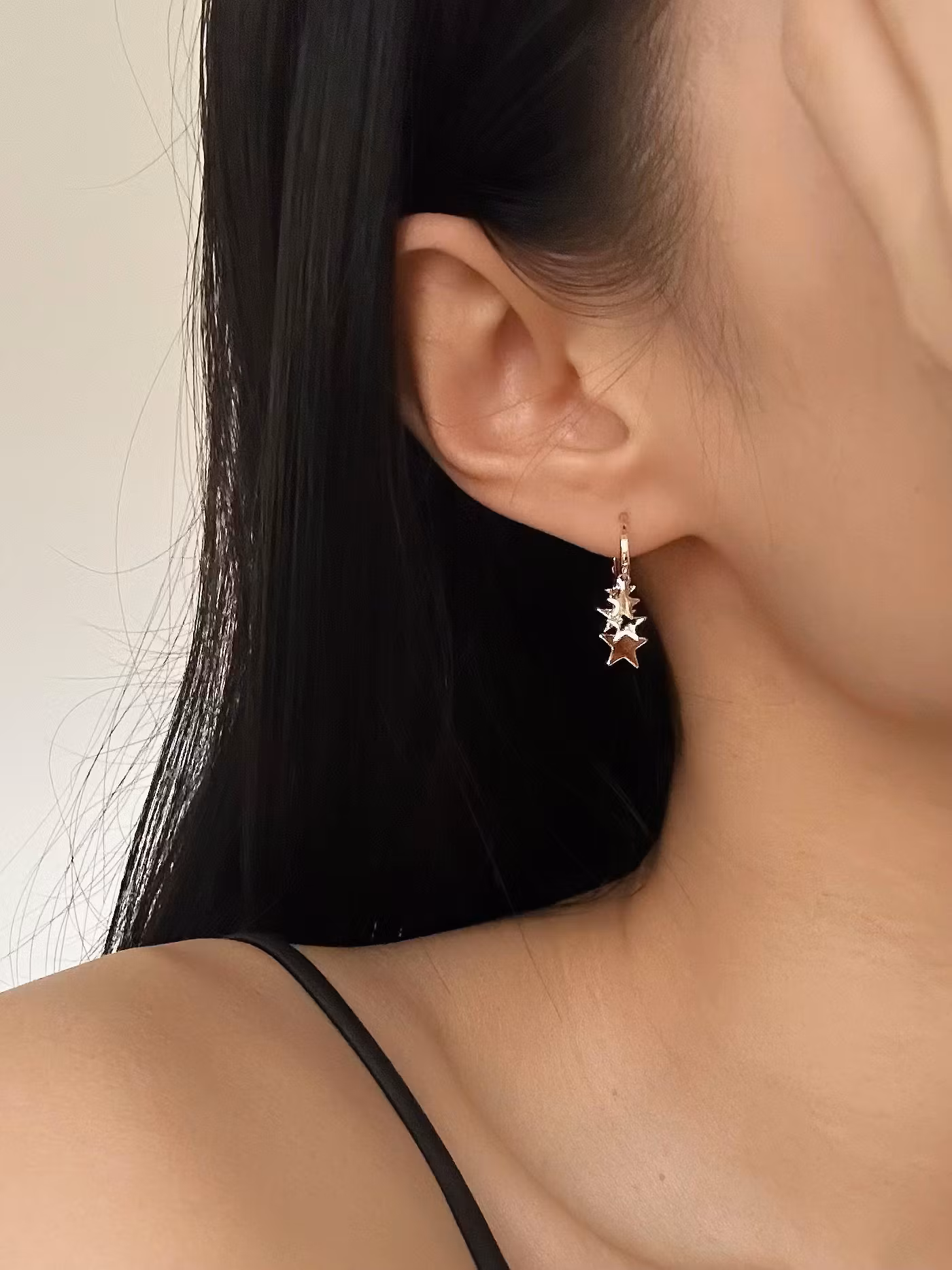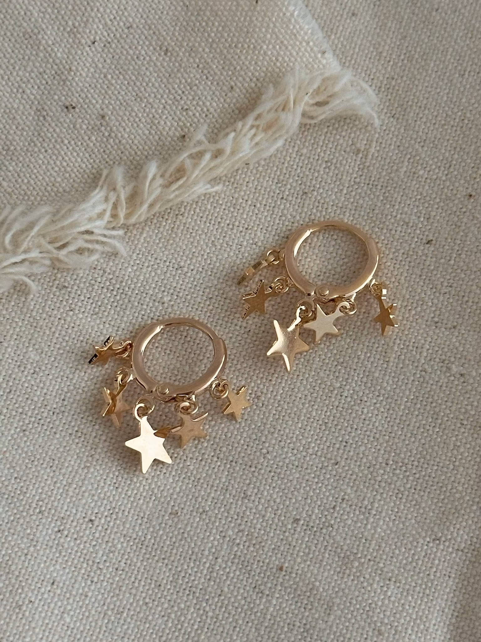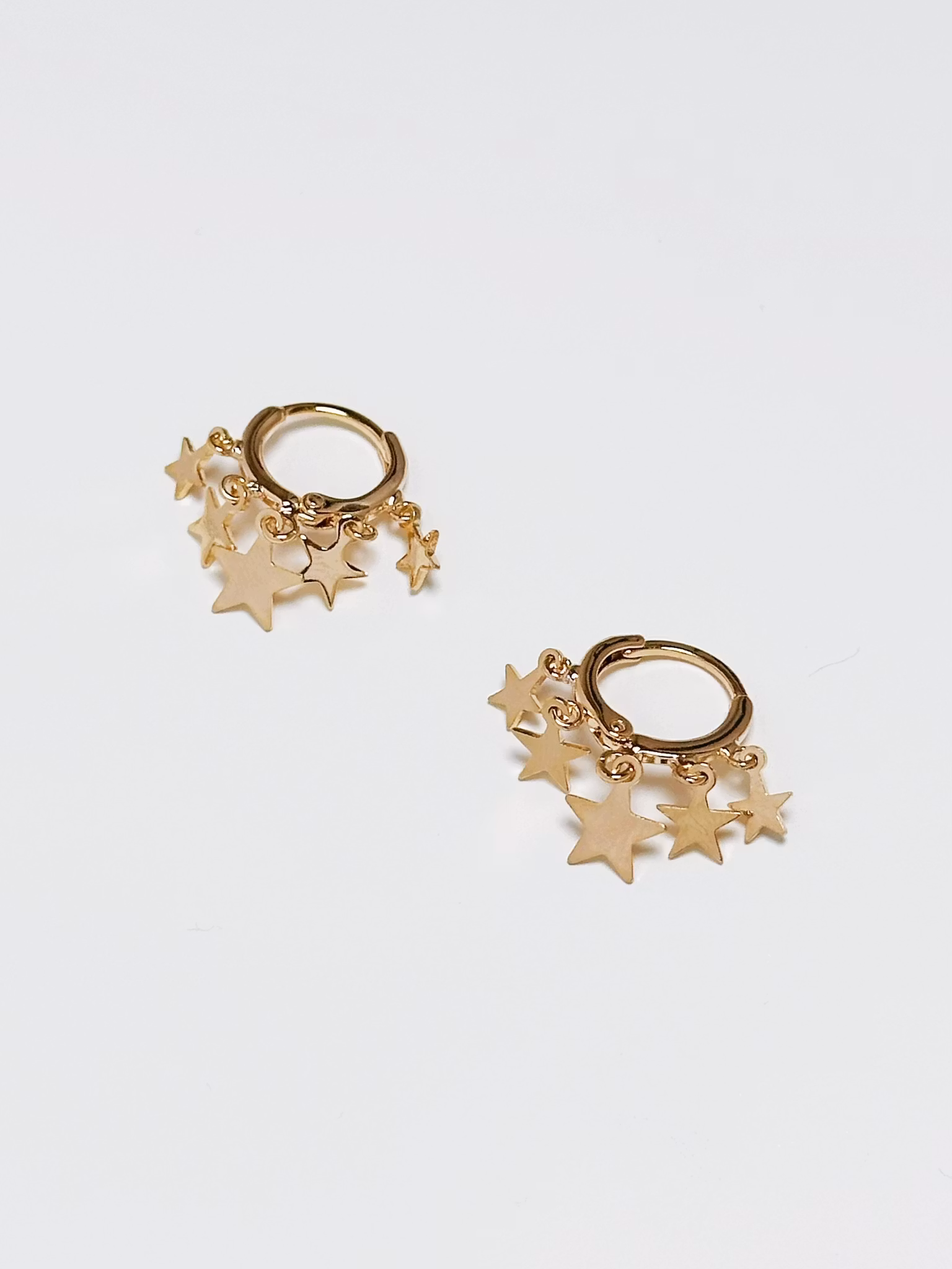 Små hoops i blank guldfärgad metall med hängen av stjärnor. Ett par enkla örhängen i tidlös design som passar till alla tillfällen.