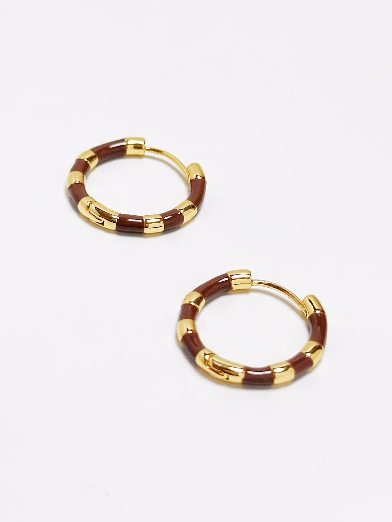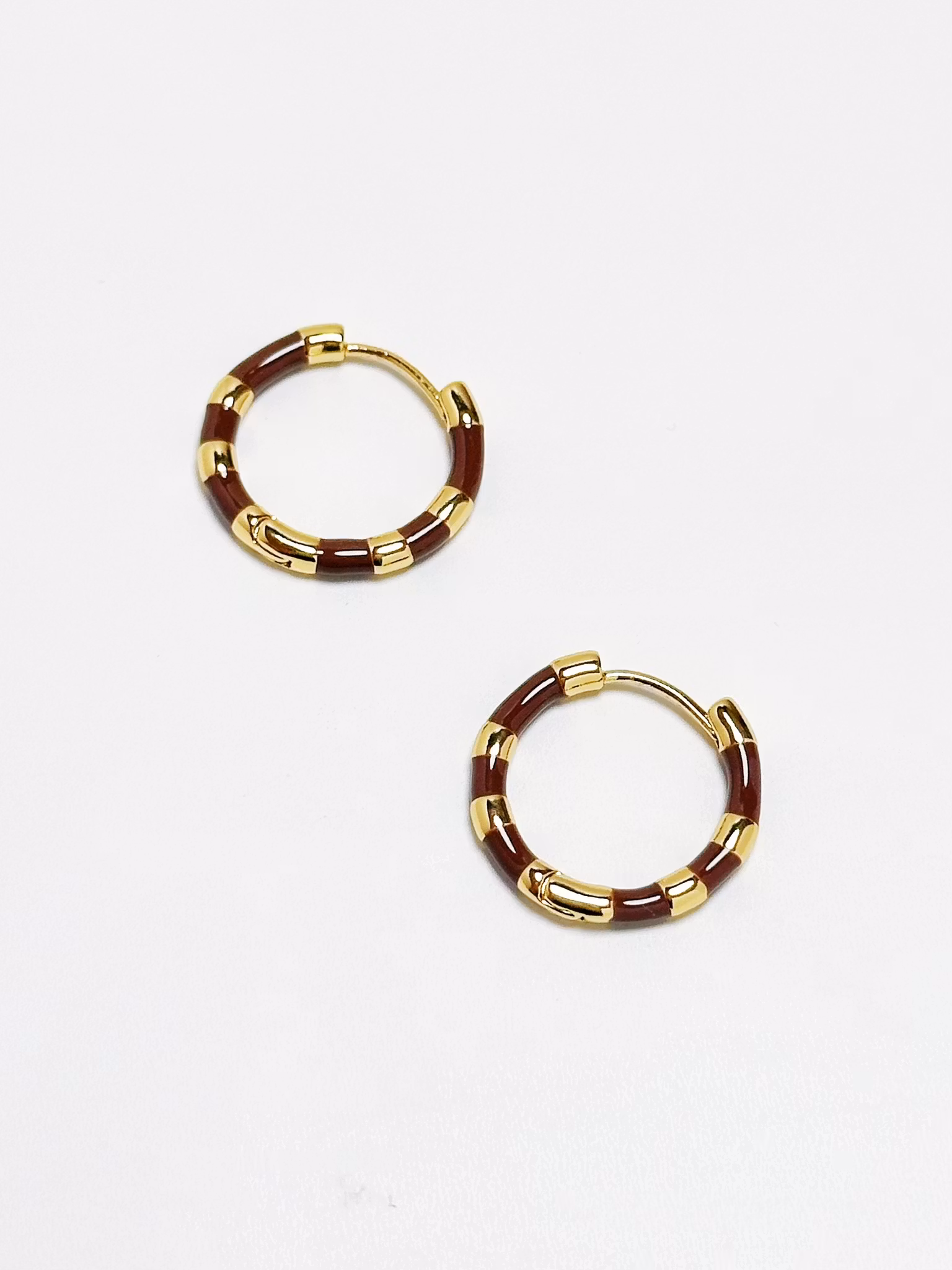 Hoops i guldfärgad metall som är dekorerad med brun emalj.ꔷ INFORMATION