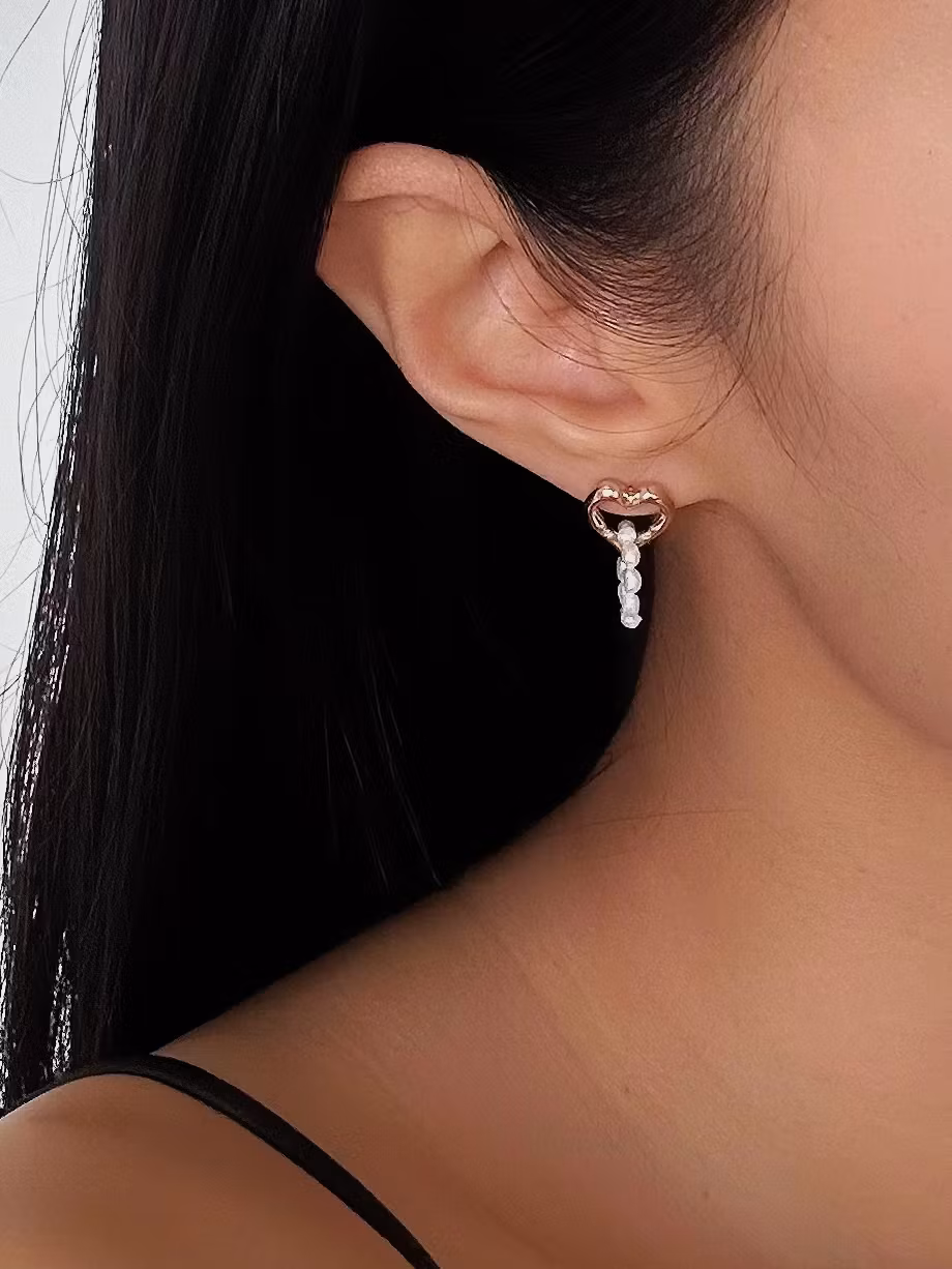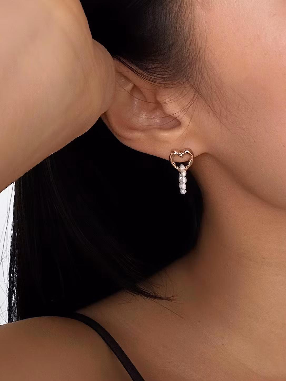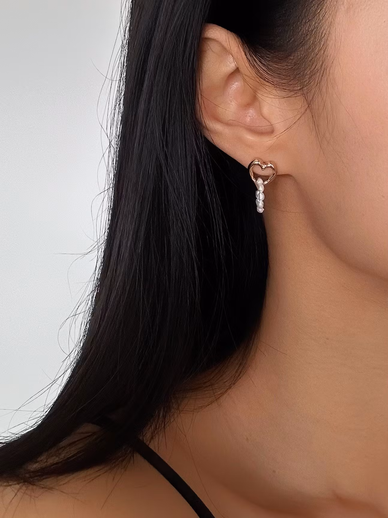 Långa guldfärgade örhängen i metall och sötvattenspärlor i olika storlekar. Hjärtörhängen i guldmetall.Ett elegant par dekorativa örhängen.