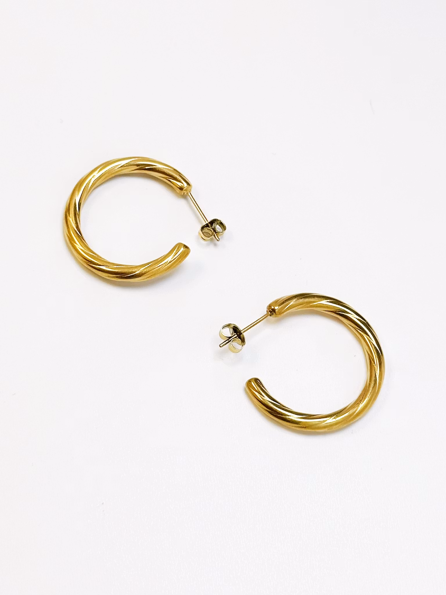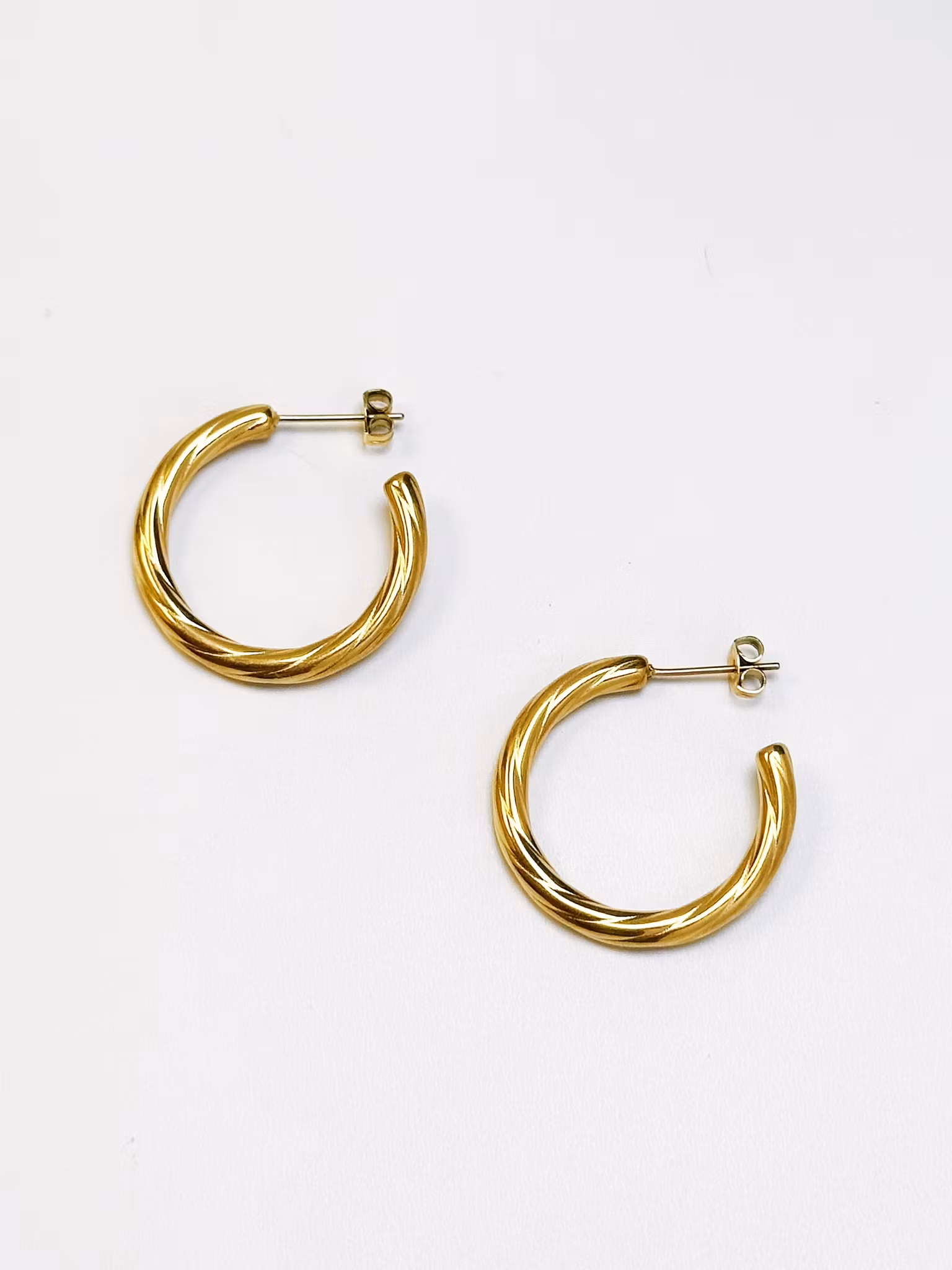 Örhängen i högpolerat rostfritt stål som är PVD-pläterat med 18K guld. Tidlöst smycke tillverkat i ett vattentåligt, allergivänligt och slitstarkt material som håller dem fina länge. Bada, duscha och träna utan att oroa dig för att de ska tappa färg.
