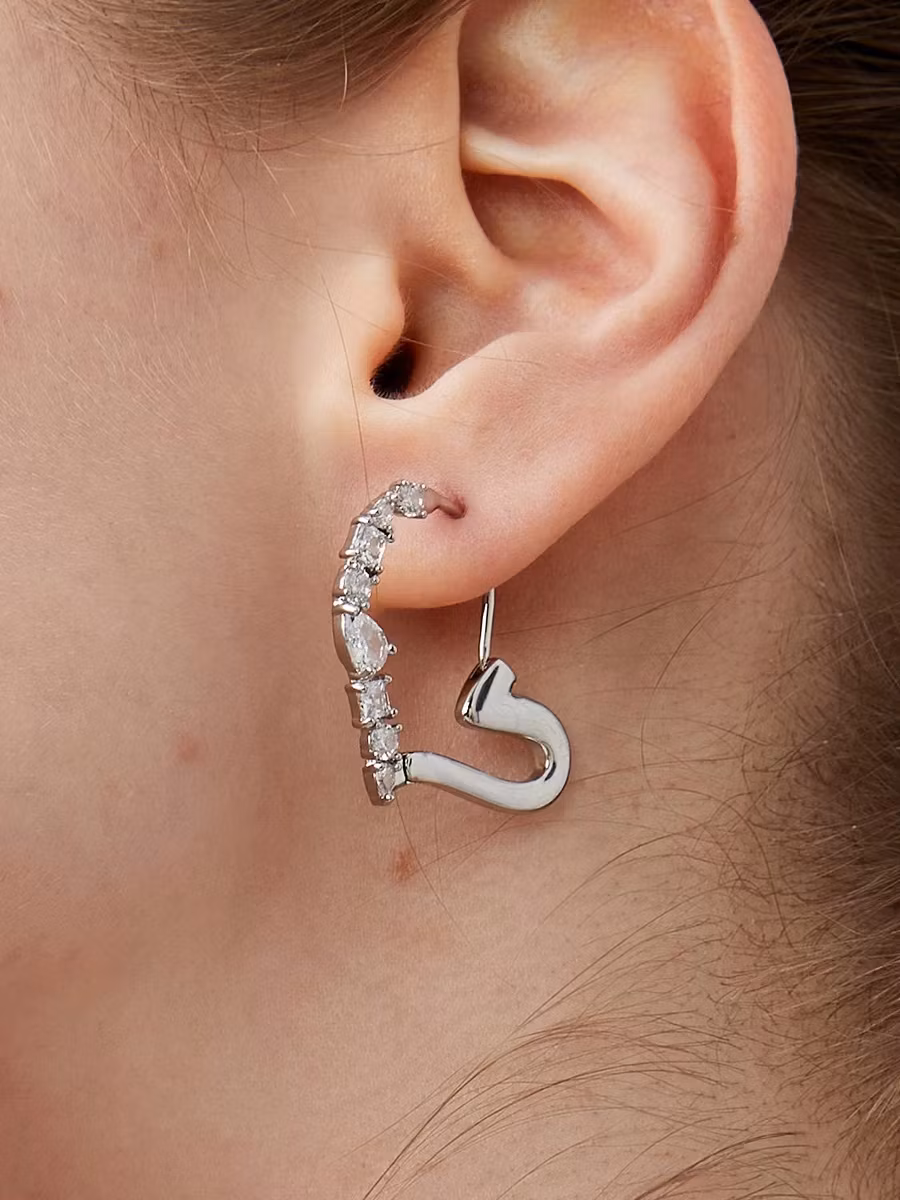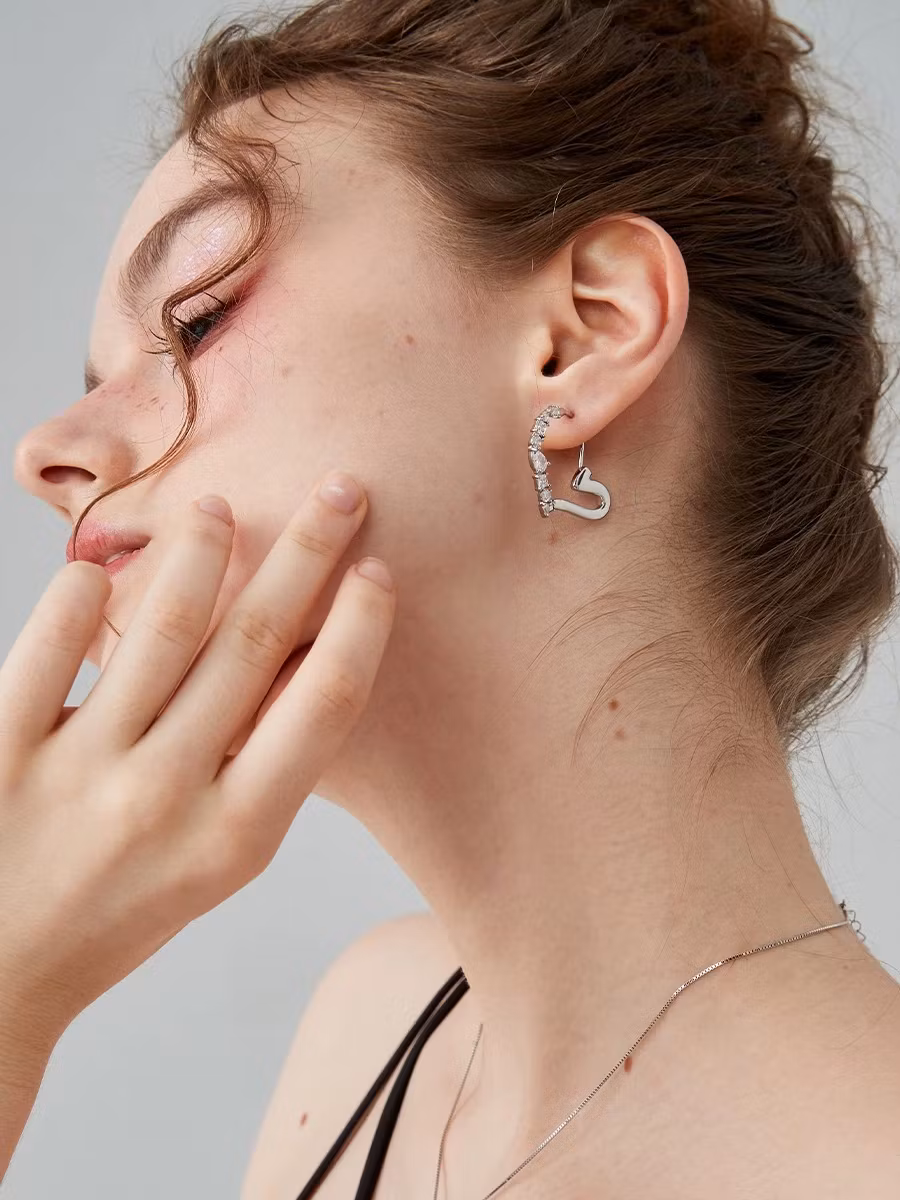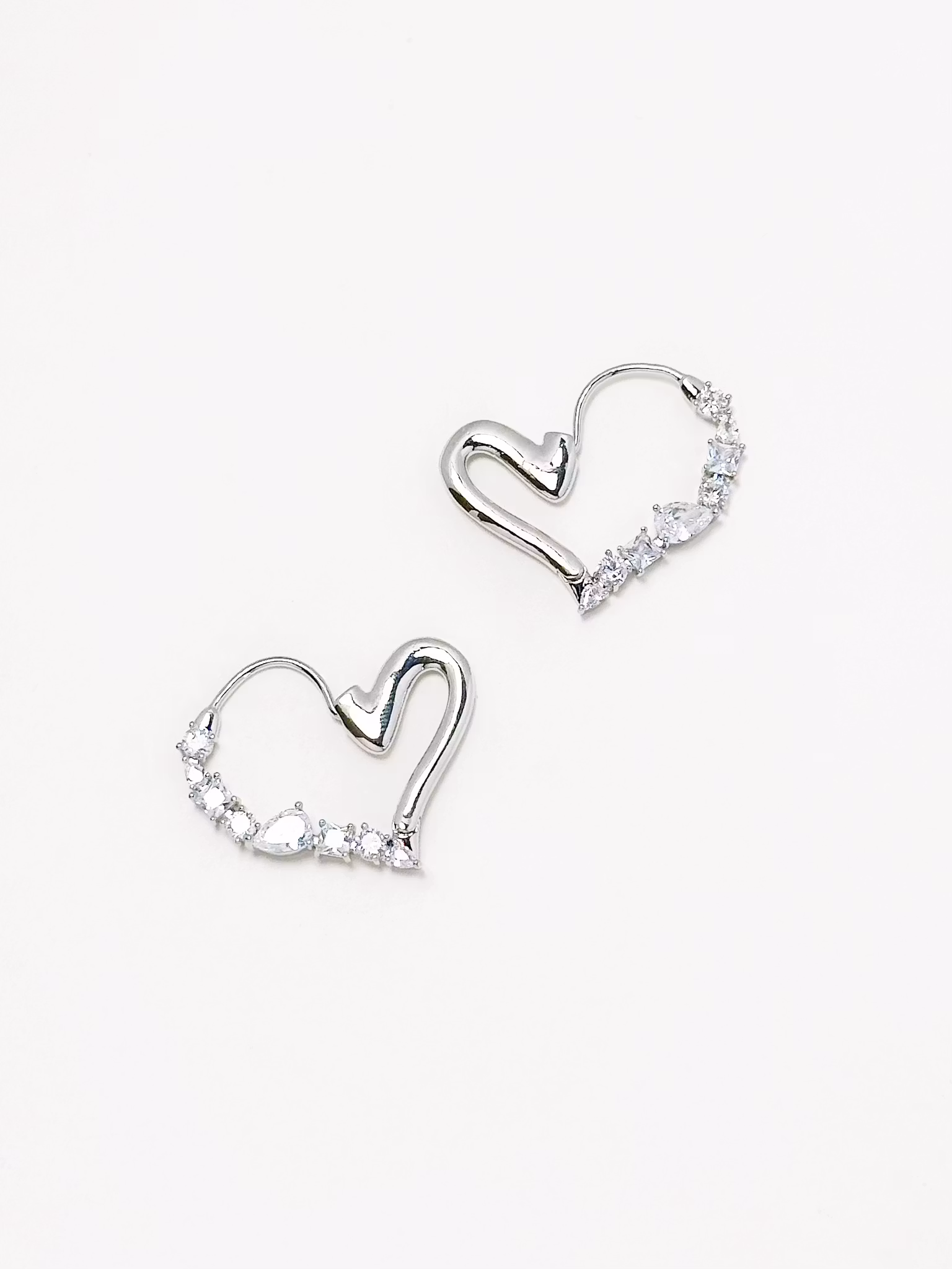 Örhängen i metall med form av ihåliga hjärtan som är dekorerade med glasstenar. Ett par enkla örhängen med stilren design och skimrig detalj som passar perfekt till festliga tillställningar eller middagsbjudningar.