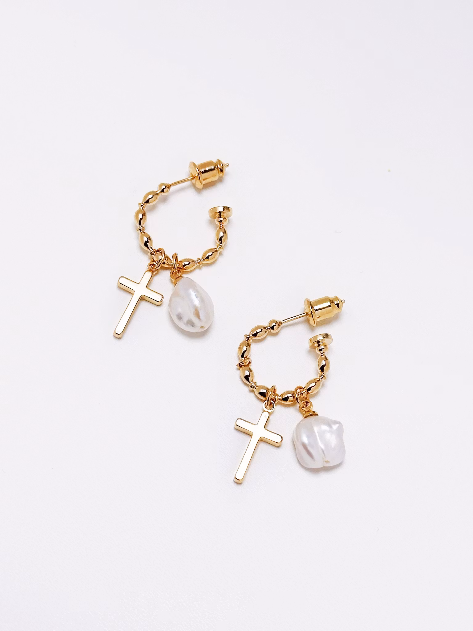 REA Hoops med kors och pärla i hänge, förgyllda med 18K guld