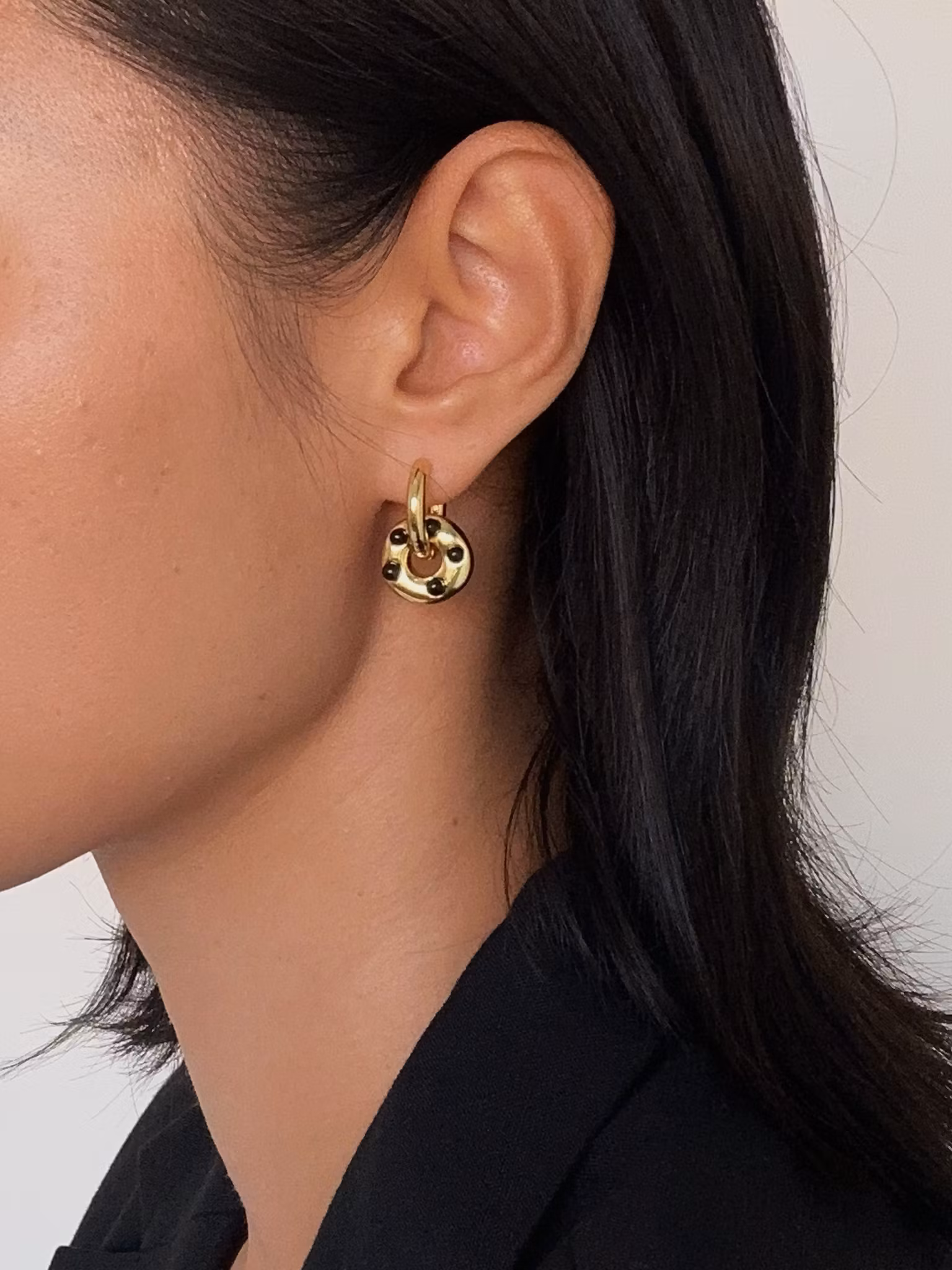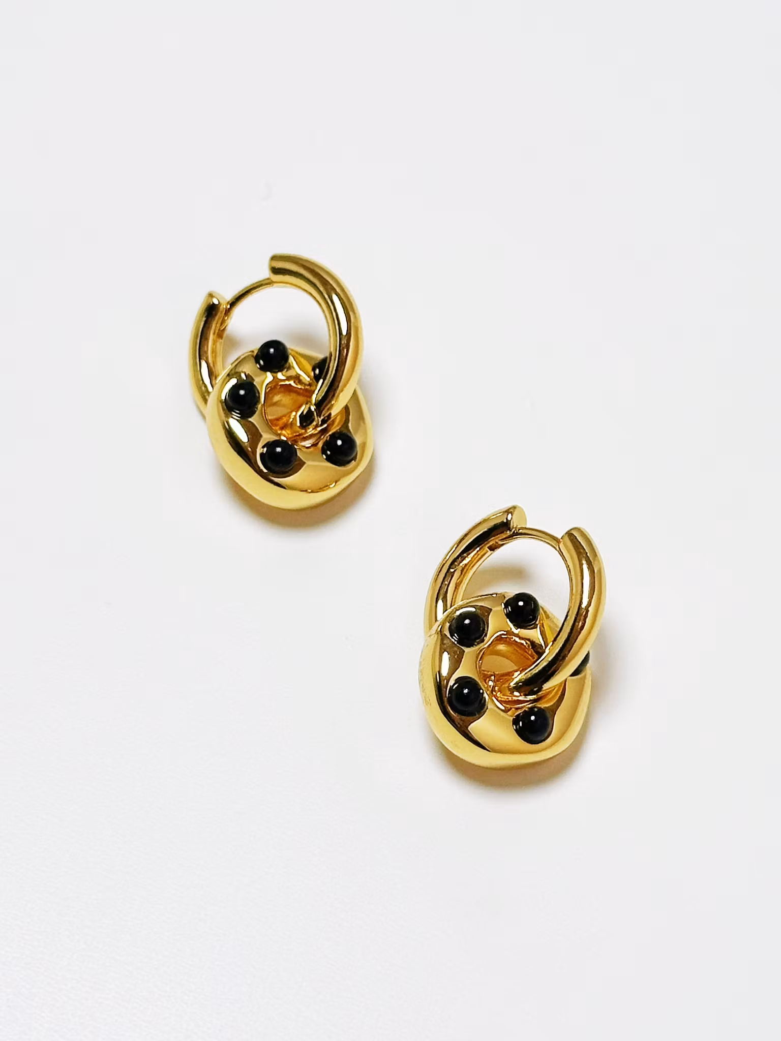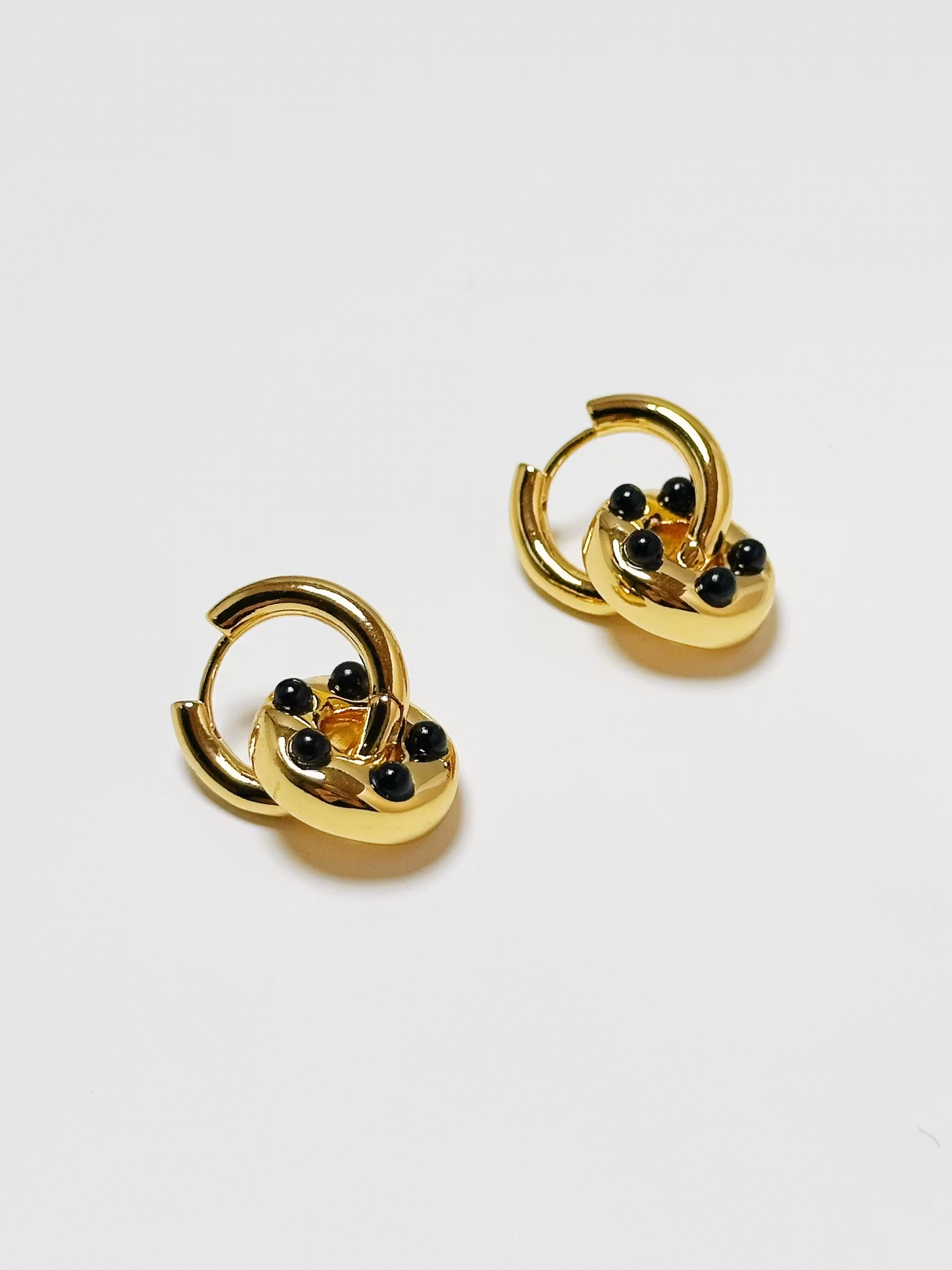 Högkvalitativ 18K guldpläterad metallbåge, dekorerad med svarta glasstenar, ett par dekorativa örhängen perfekta för fest och vardag.ꔷ INFORMATION
