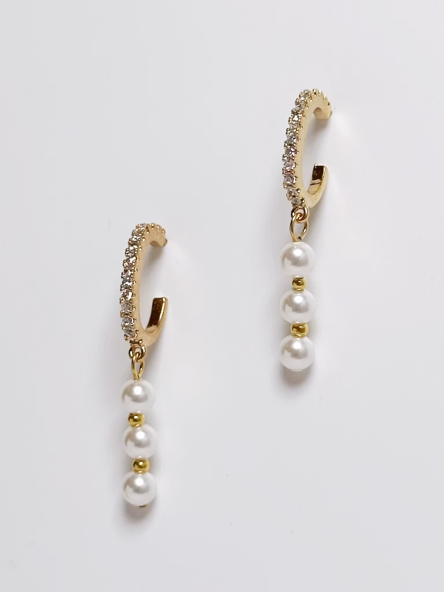 Örhängen i guldfärgad metall med glasstenar och tre vita pärlor längst ner. Ett par dekorativa örhängen som kommer dingla fritt. Perfekta till festliga tillställningar.