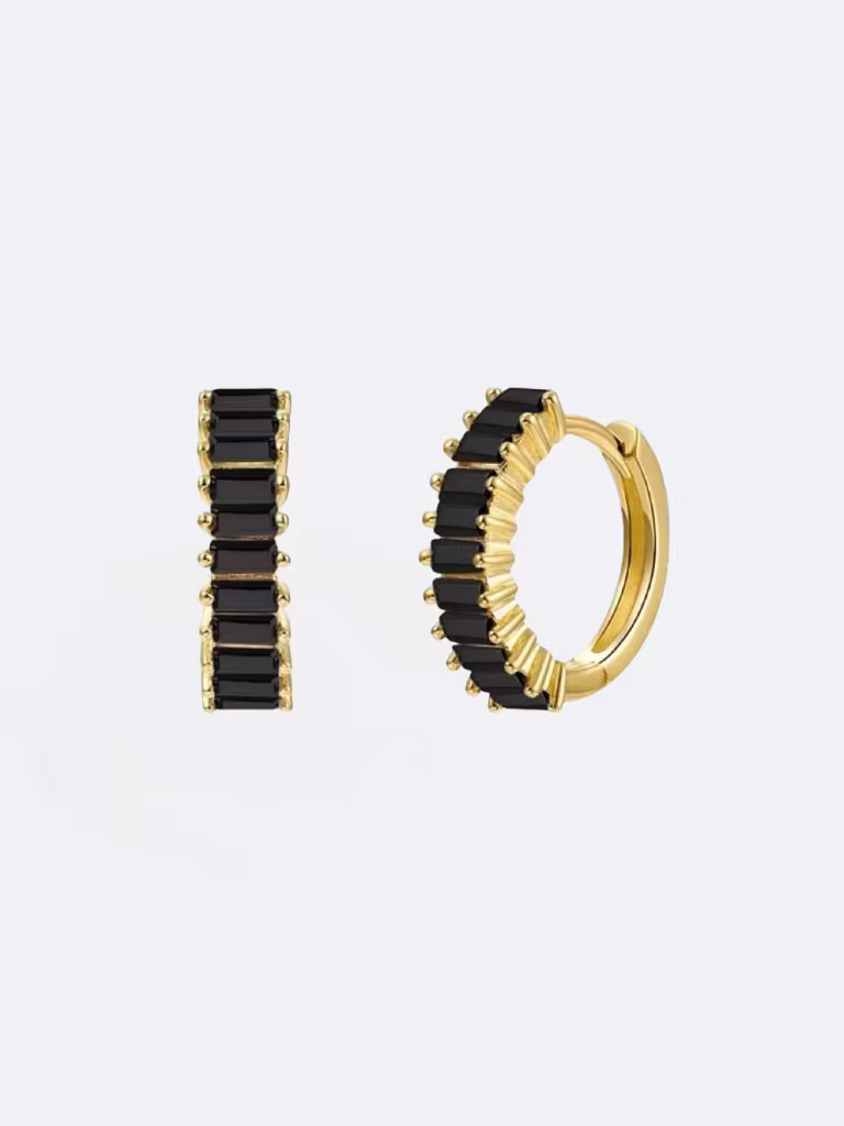ꔷ BESKRIVNINGBreda små hoops i guldfärgad metall som är dekorerade med fyrkantiga glasstenar i svart. Ett par skimriga örhängen som passar både till vardags och fest.