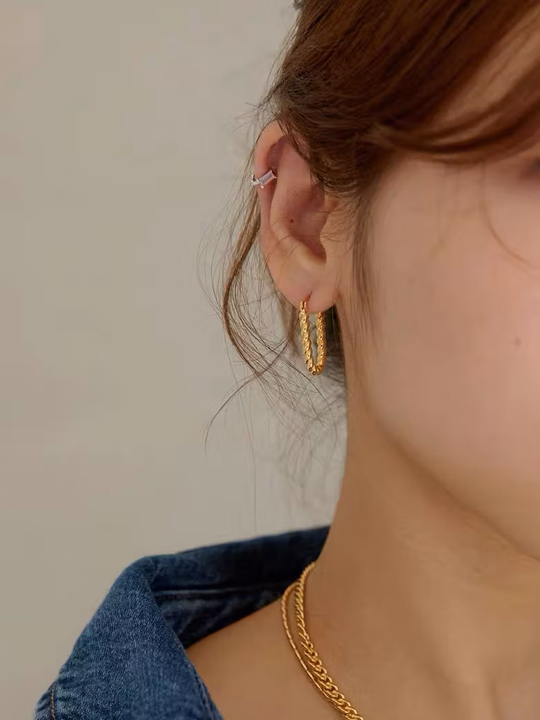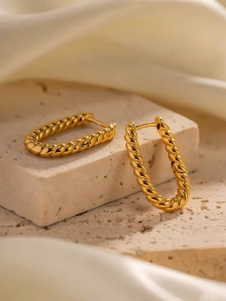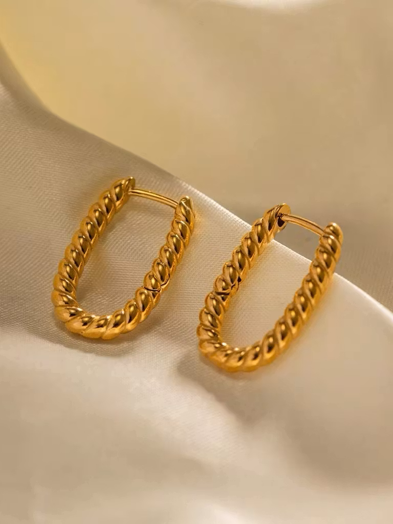 Högkvalitativa 18K guldpläterade örhängen med en twistdesign, idealisk storlek för vardagsbruk och ger en rolig detalj till dina outfits.