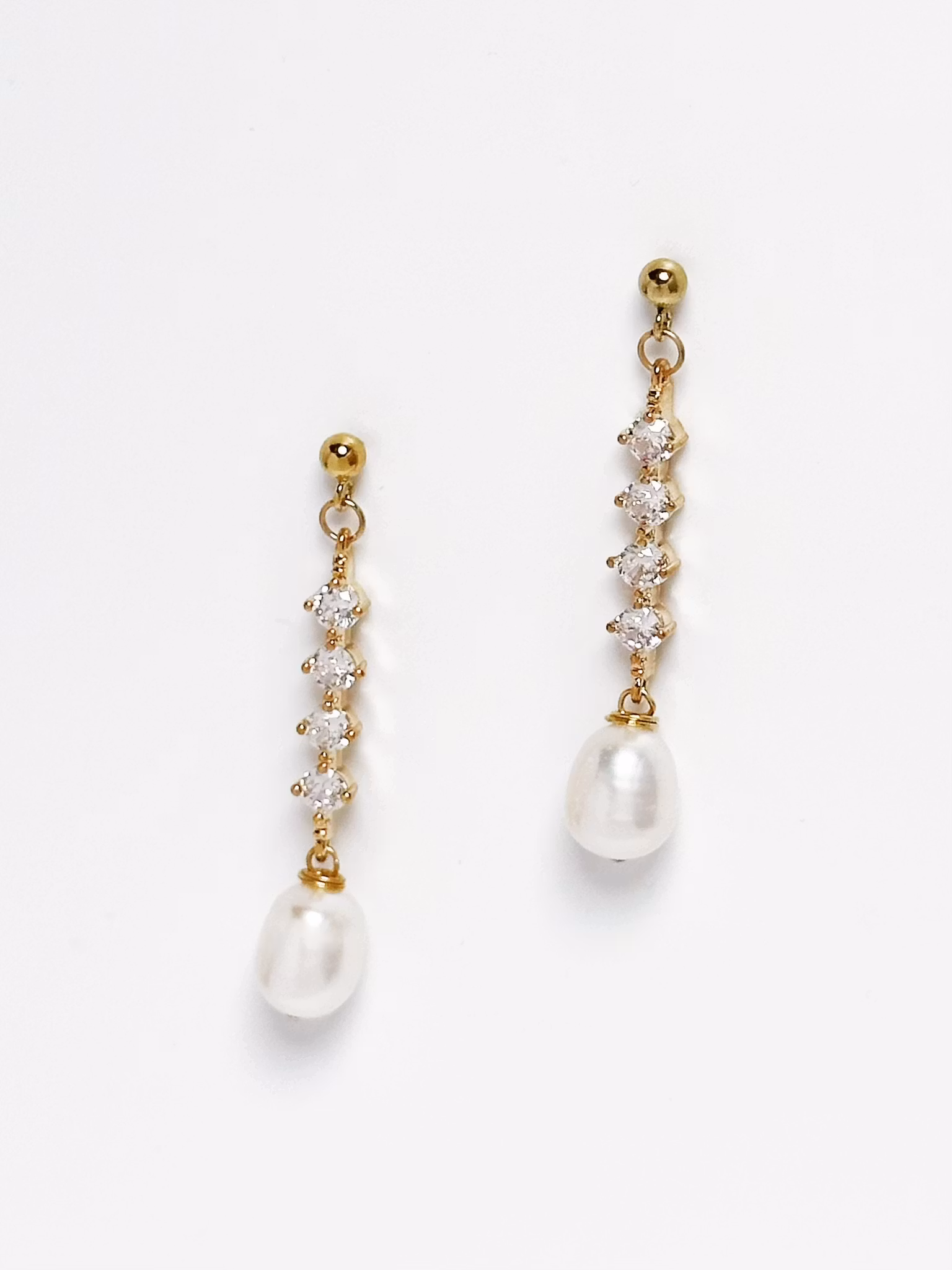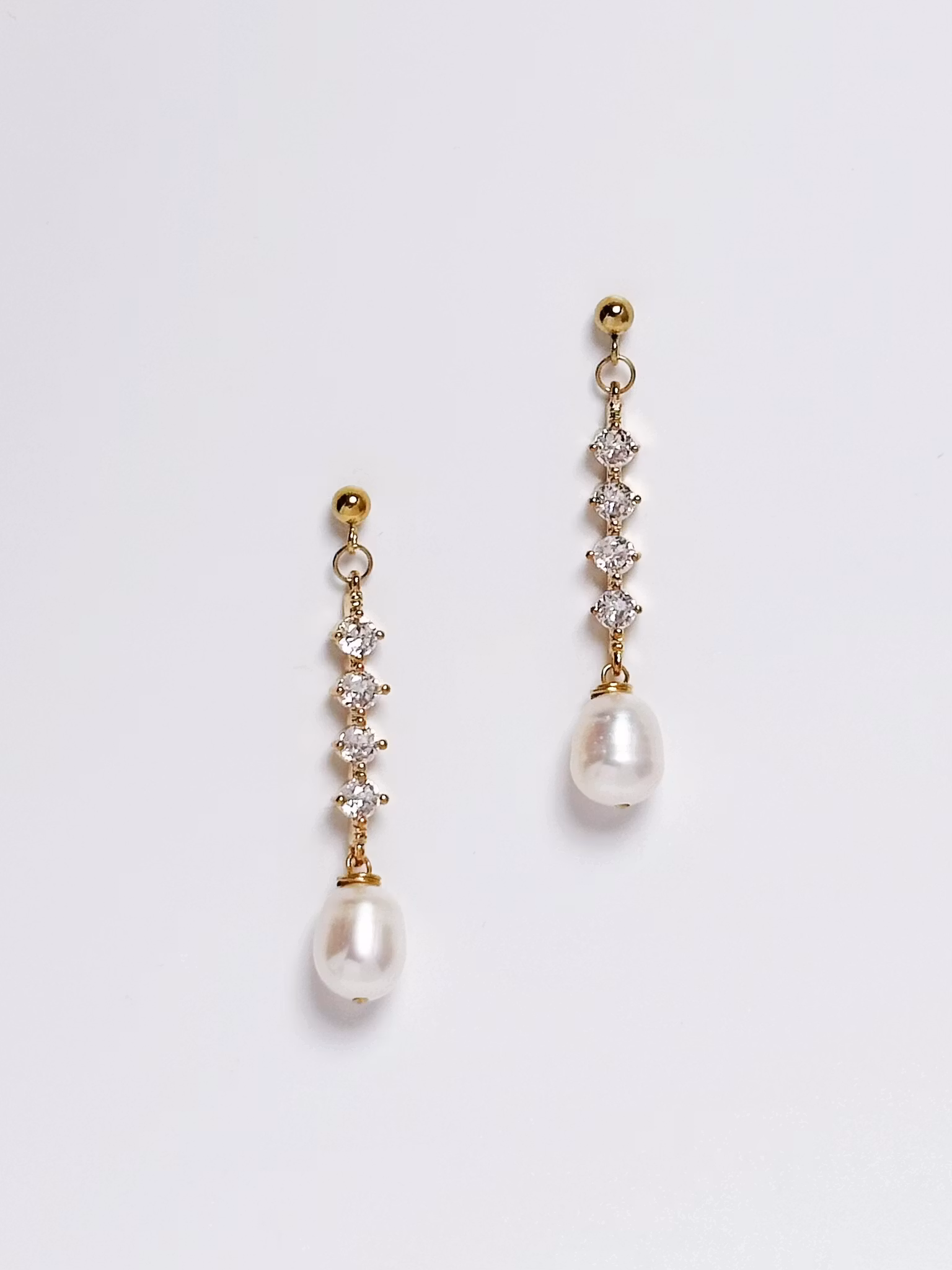 Örhängena är gjorda av 14K guldfyllt från USA, som har en högre guldhalt än guldplätering. Det är 1/20 av guldets vikt i den internationella standarden, och det är gjutet tillsammans med andra metaller vid hög temperatur. Den presenterar den ljusa gyllene lystern som unga människor älskar, och den är skuren i en färg från insidan till utsidan. Bra färghållning. Naturliga sötvattenspärlor och glänsande zirkoner, eleganta och enkla, kan ges i present.
